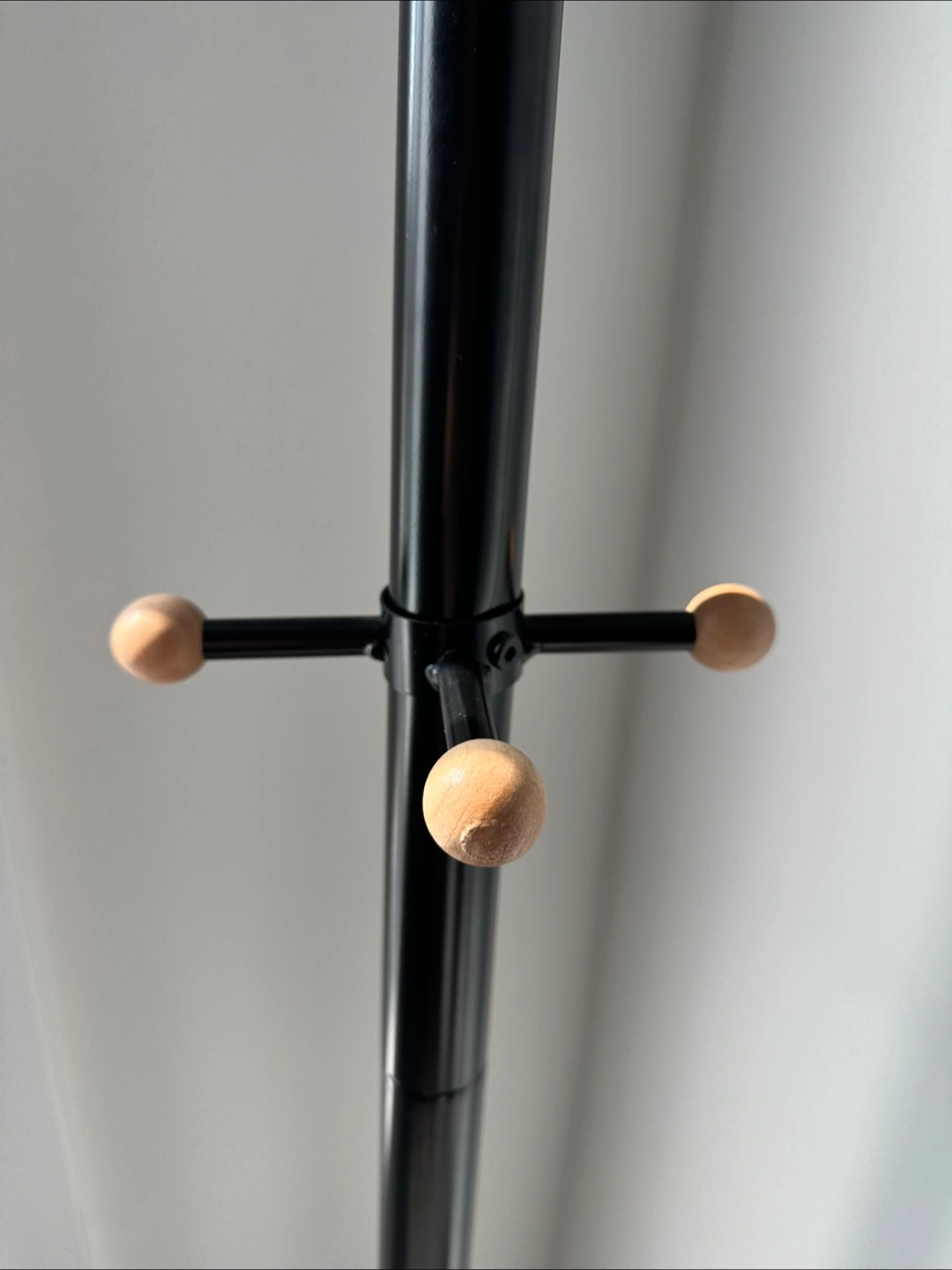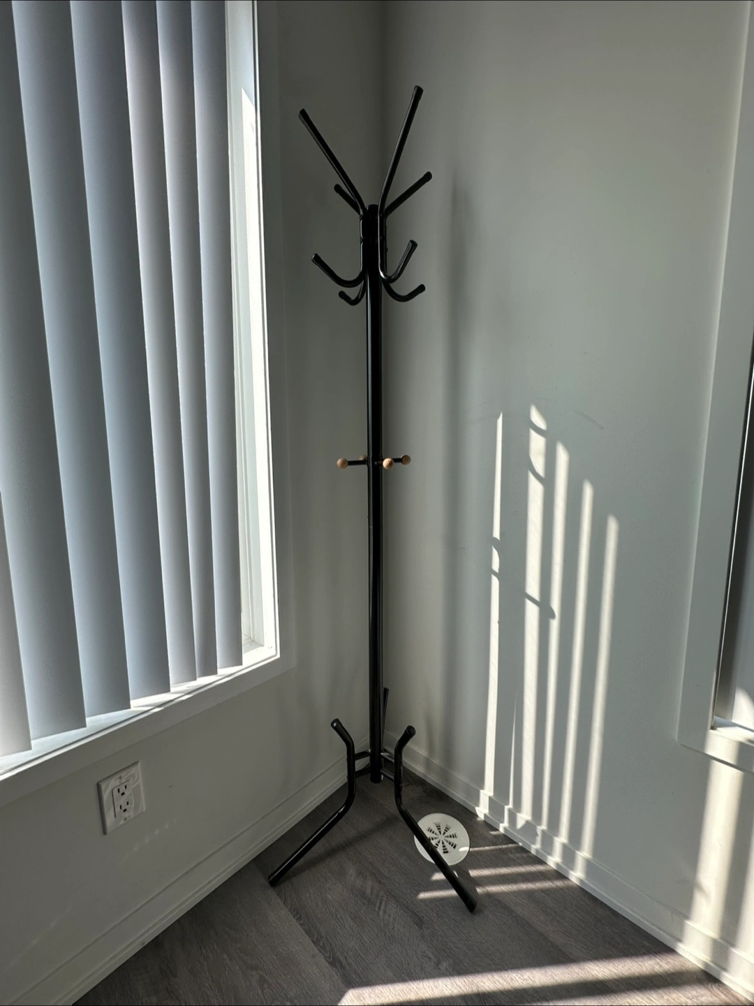 Here's a simple black metal coat rack stand! It's perfect for hanging coats, hats, and bags. It's in great condition and easy to assemble. Great for small spaces