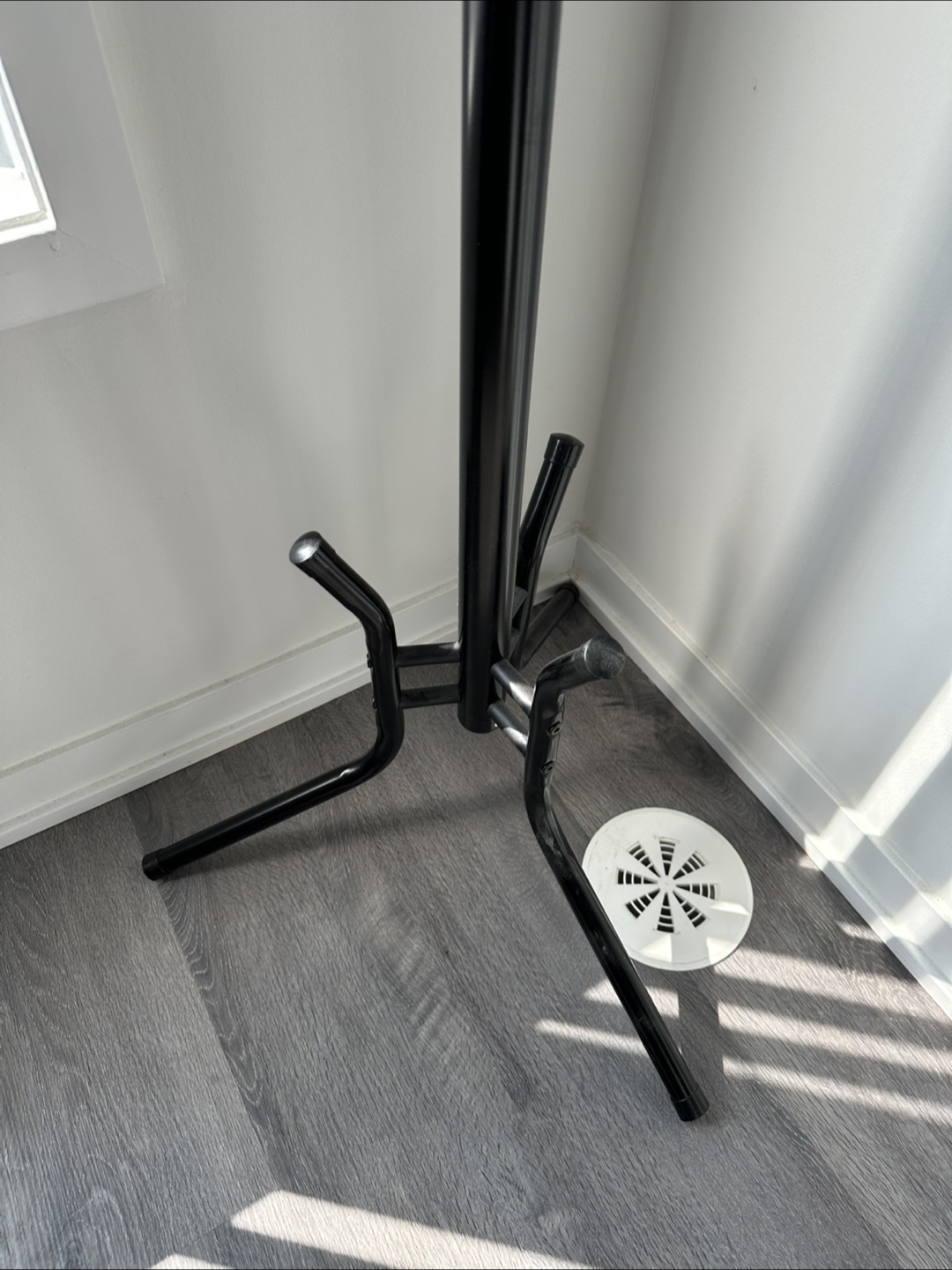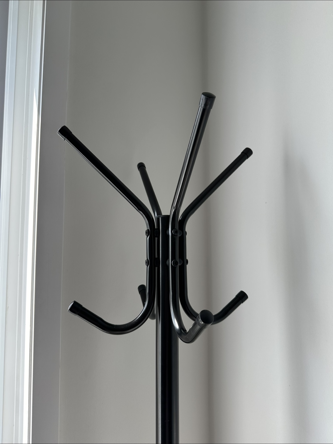 Here's a simple black metal coat rack stand! It's perfect for hanging coats, hats, and bags. It's in great condition and easy to assemble. Great for small spaces