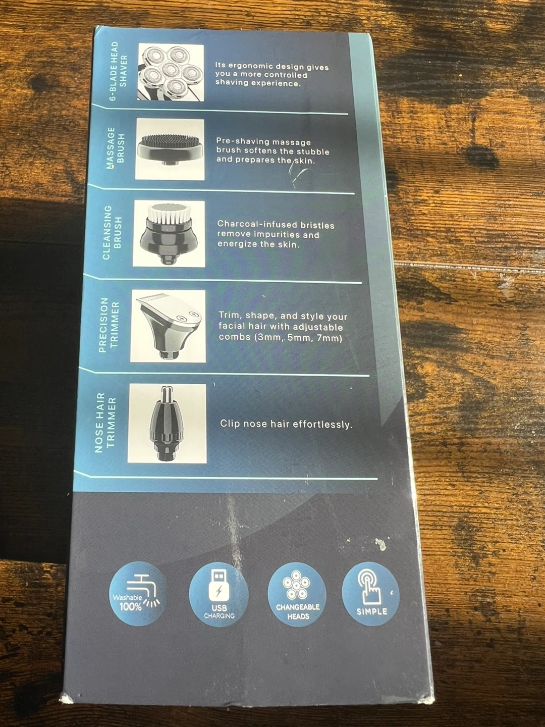 This 5-in-1 electric shaver features a 6-blade head for quick shaving. It includes a facial cleansing brush, precision trimmer, nose hair trimmer, and massage brush. It's washable and offers USB charging for convenience.in excellent condition