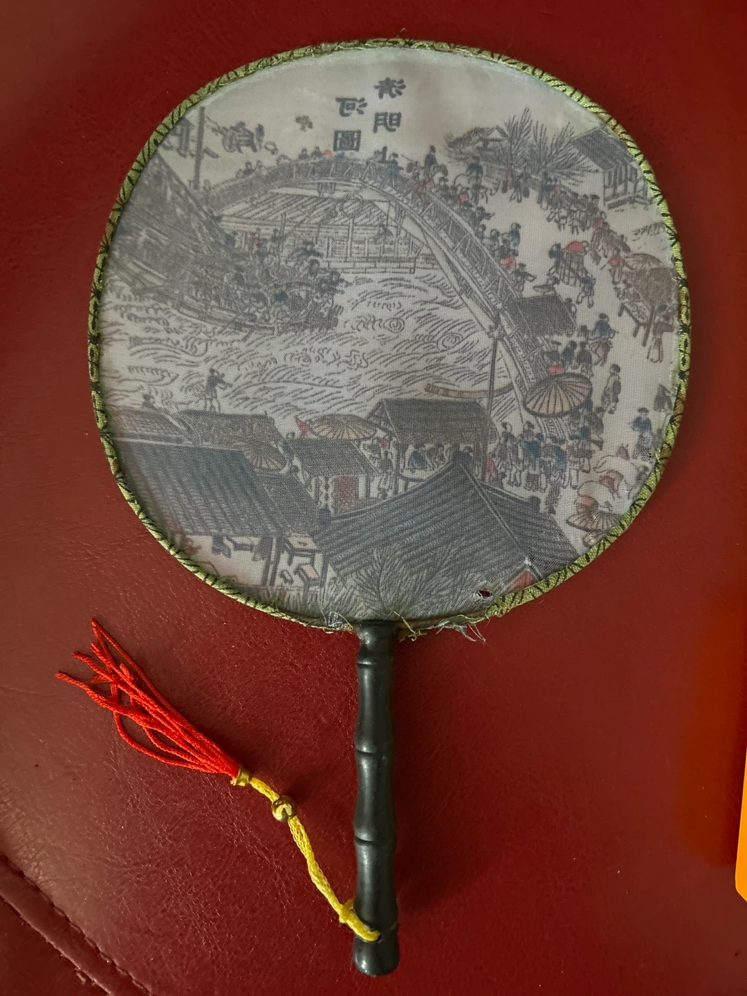 This round decorative fan features a scenic print with a red tassel attached. It's approximately 10 inches in diameter. This fan adds a unique touch of style. Very useful in a warm day.