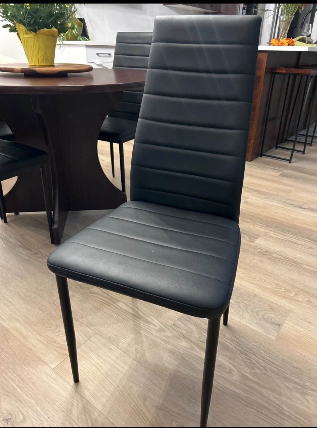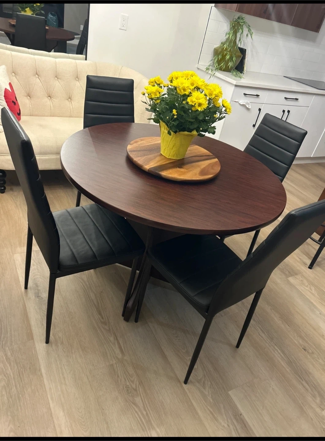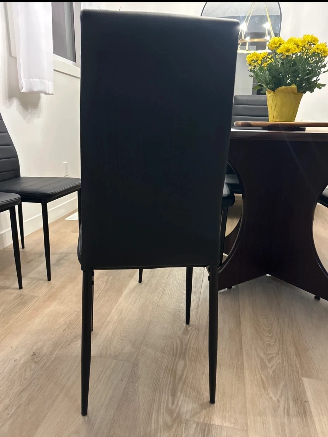 Selling a solid dining table with lazy susan and six chairs. The chairs are black with a sleek, modern design. The table and chairs are in great condition and would be a nice addition to any dining space.