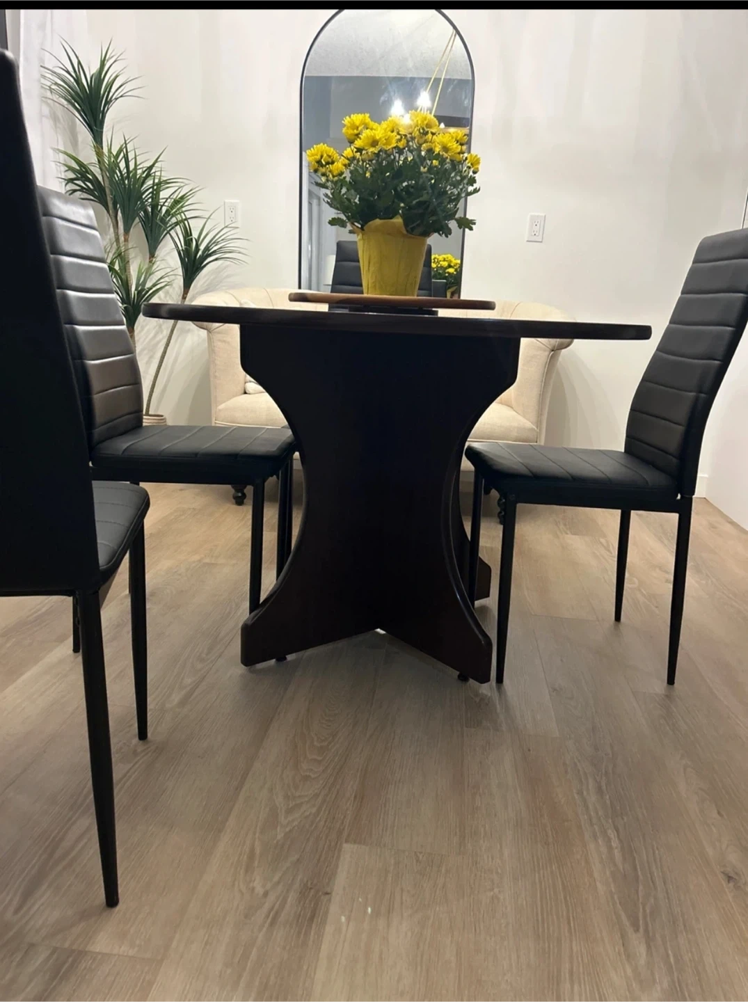 Selling a solid dining table with lazy susan and six chairs. The chairs are black with a sleek, modern design. The table and chairs are in great condition and would be a nice addition to any dining space.