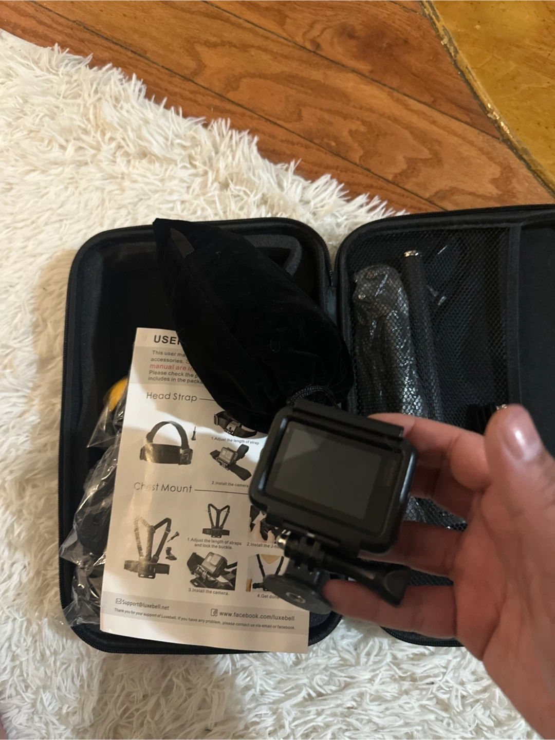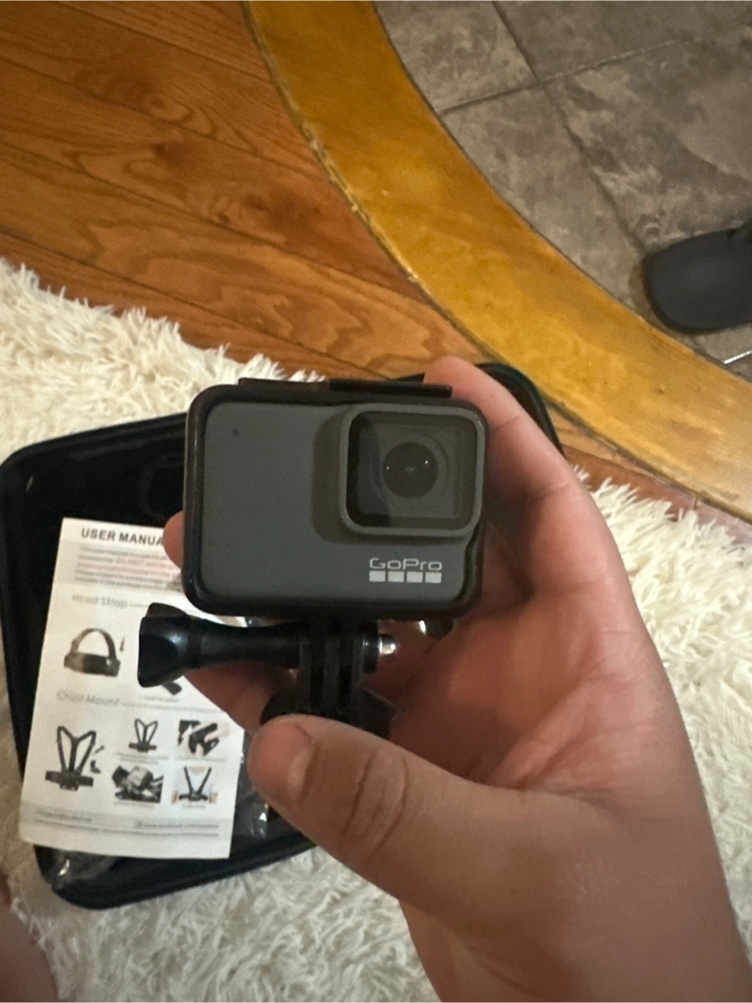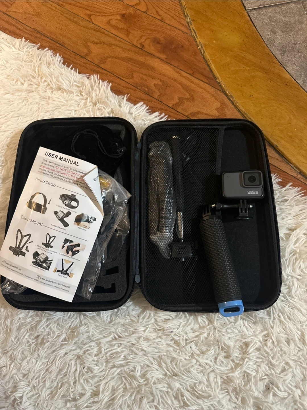 GoPro HERO7 Black action camera and various accessories. Includes a carrying case, chest mount, head strap, and manual. Ready for your adventures!