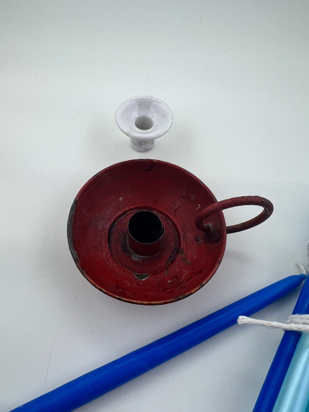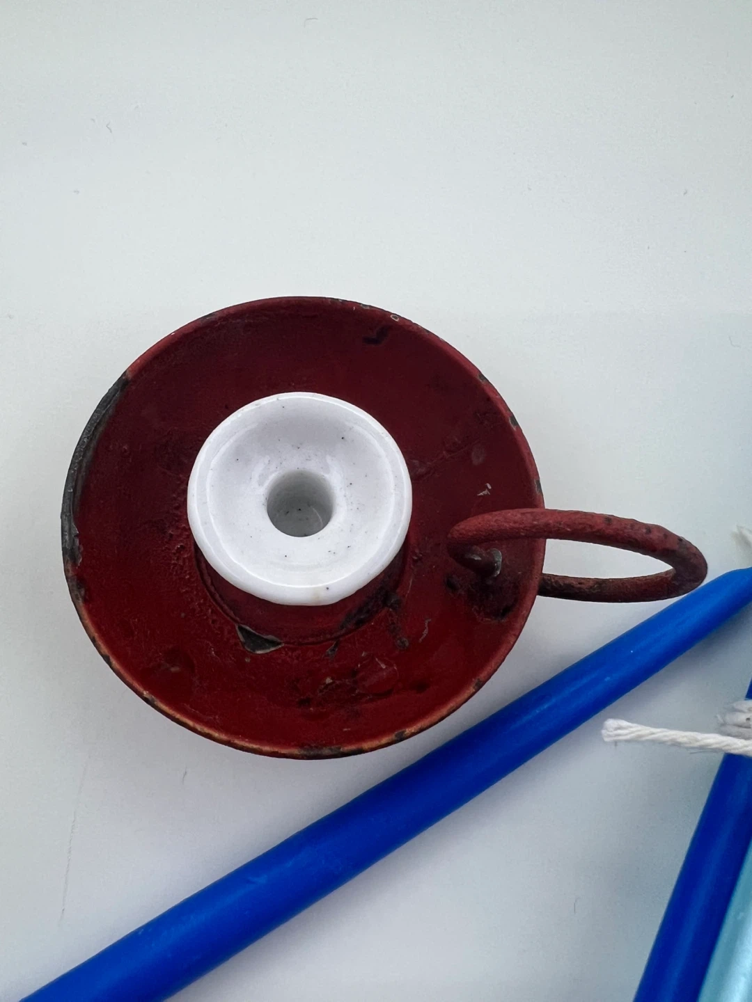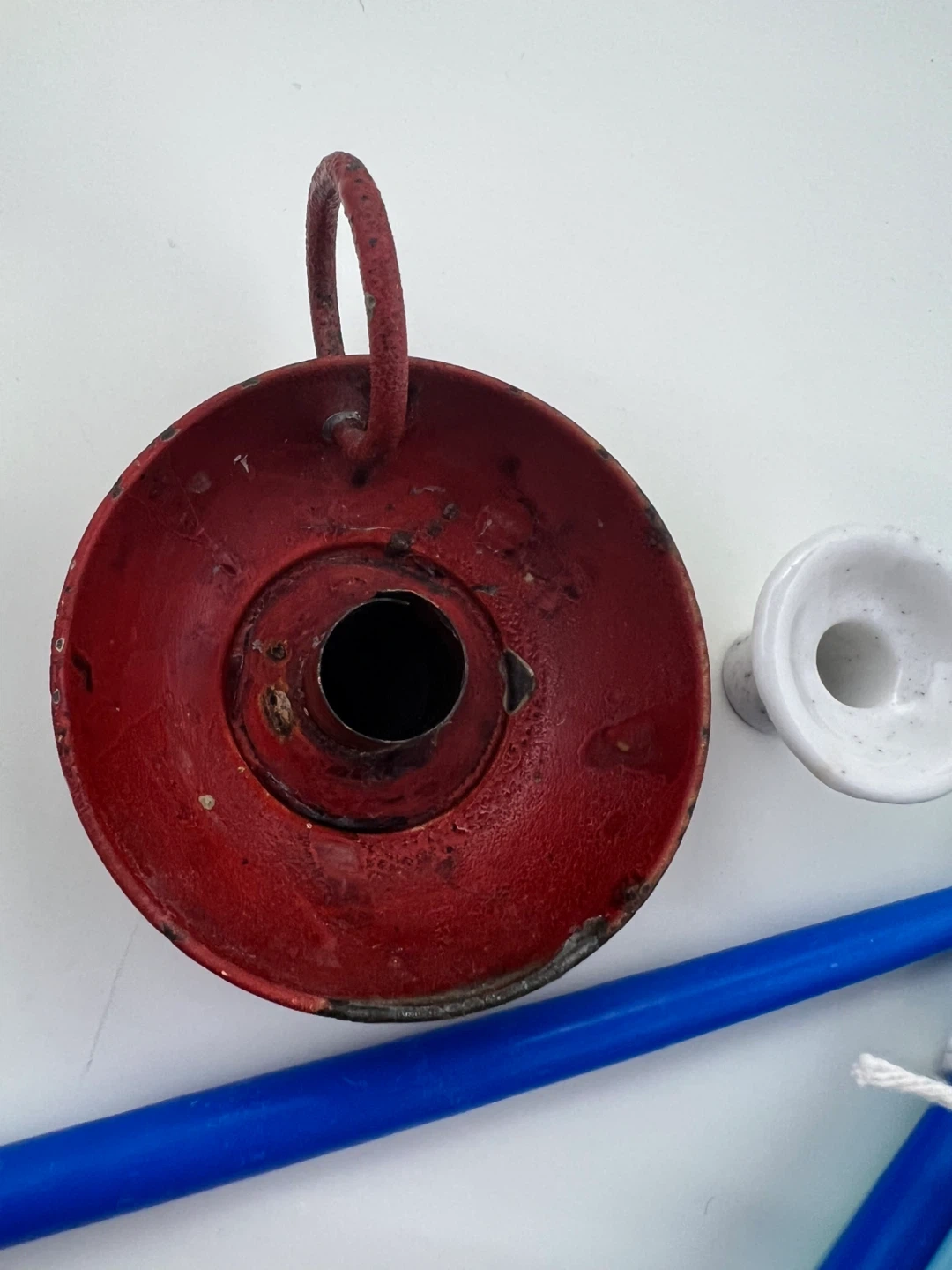 This candle holder is made of metal (likely tin or iron) coated in a red enamel finish, a popular style in French and other European farmhouse decor