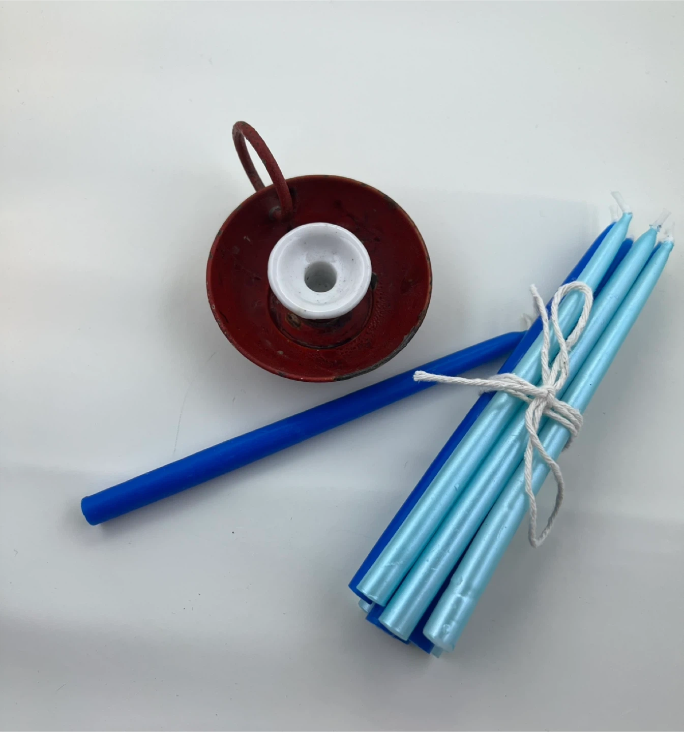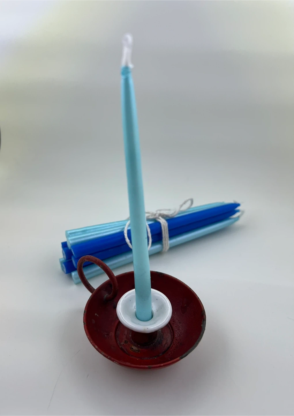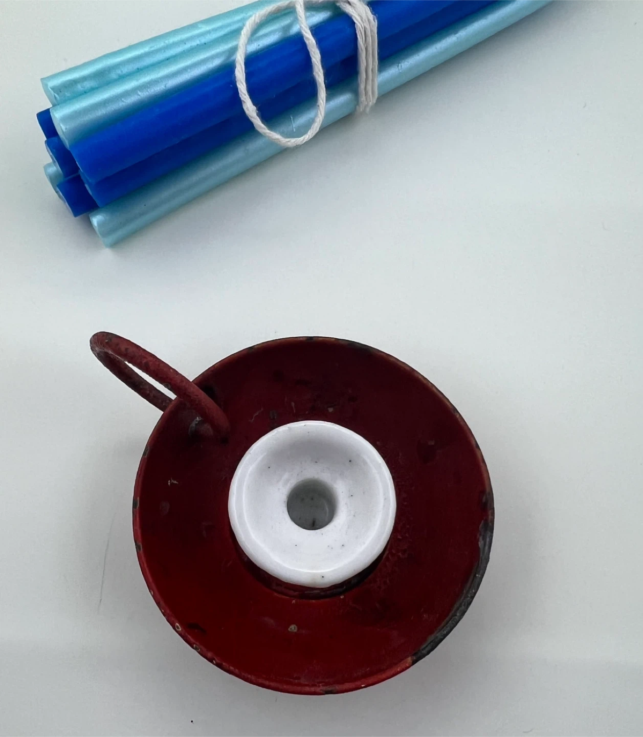 This candle holder is made of metal (likely tin or iron) coated in a red enamel finish, a popular style in French and other European farmhouse decor
