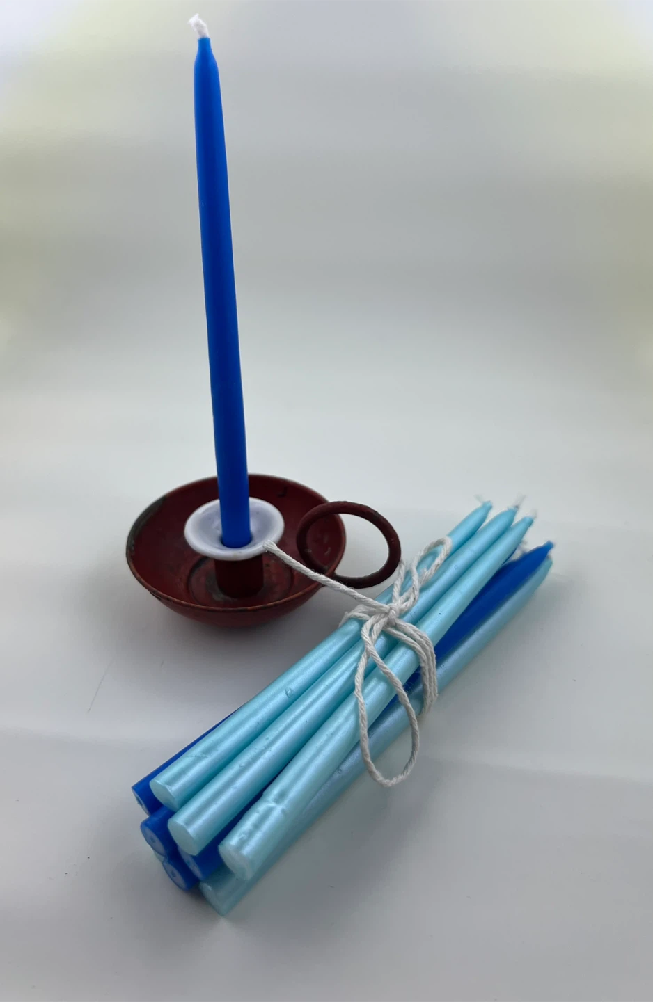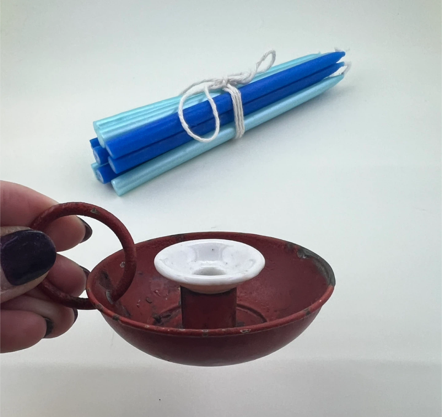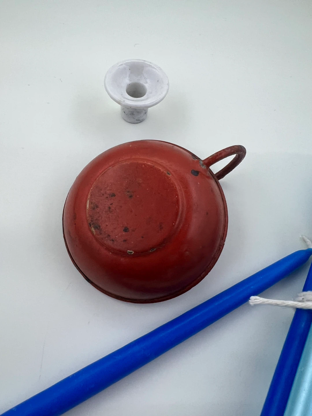 This candle holder is made of metal (likely tin or iron) coated in a red enamel finish, a popular style in French and other European farmhouse decor