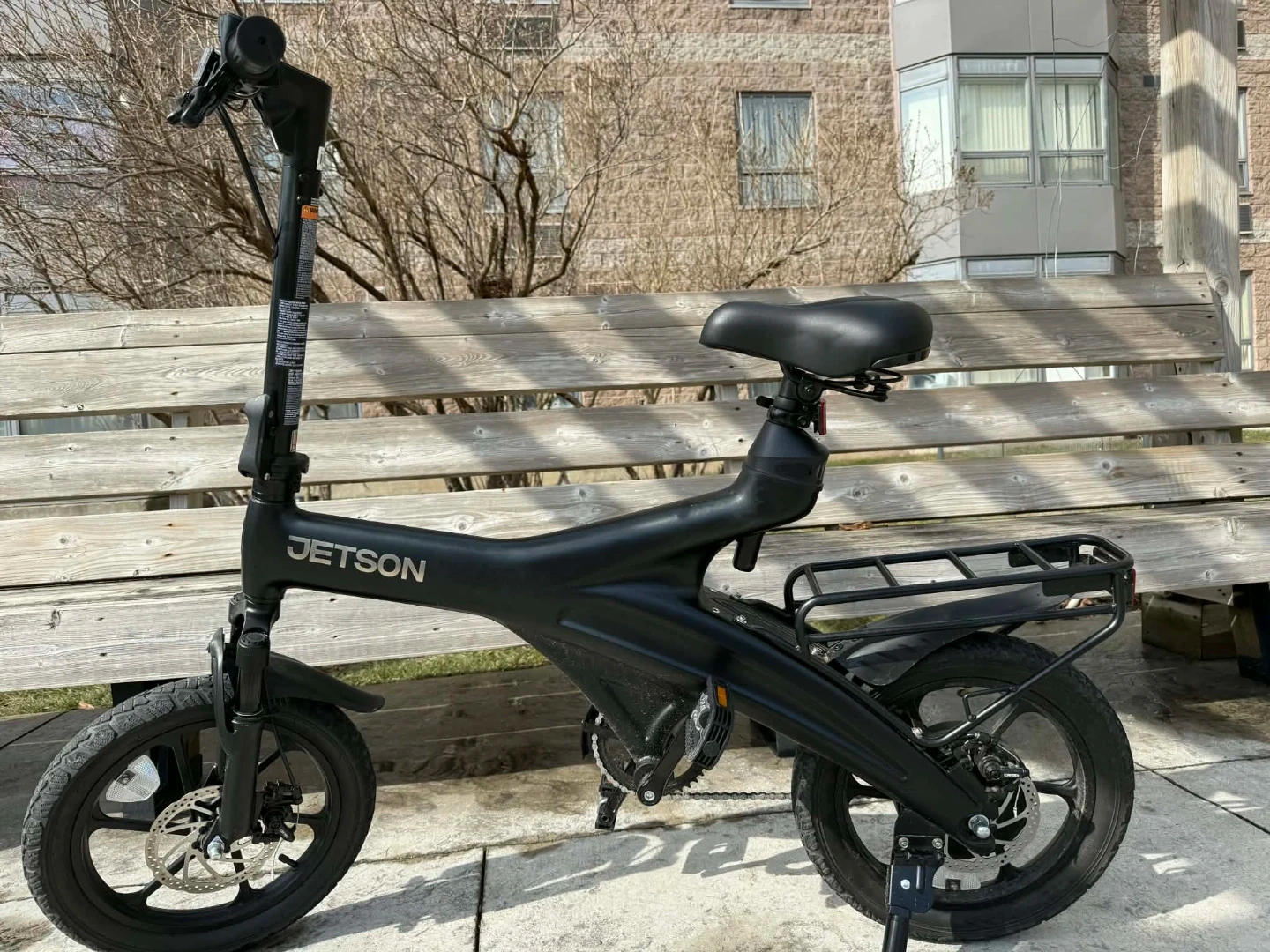 Jetson electric folding bike in black. It's a compact commuter option. Great for getting around town quickly and easily!