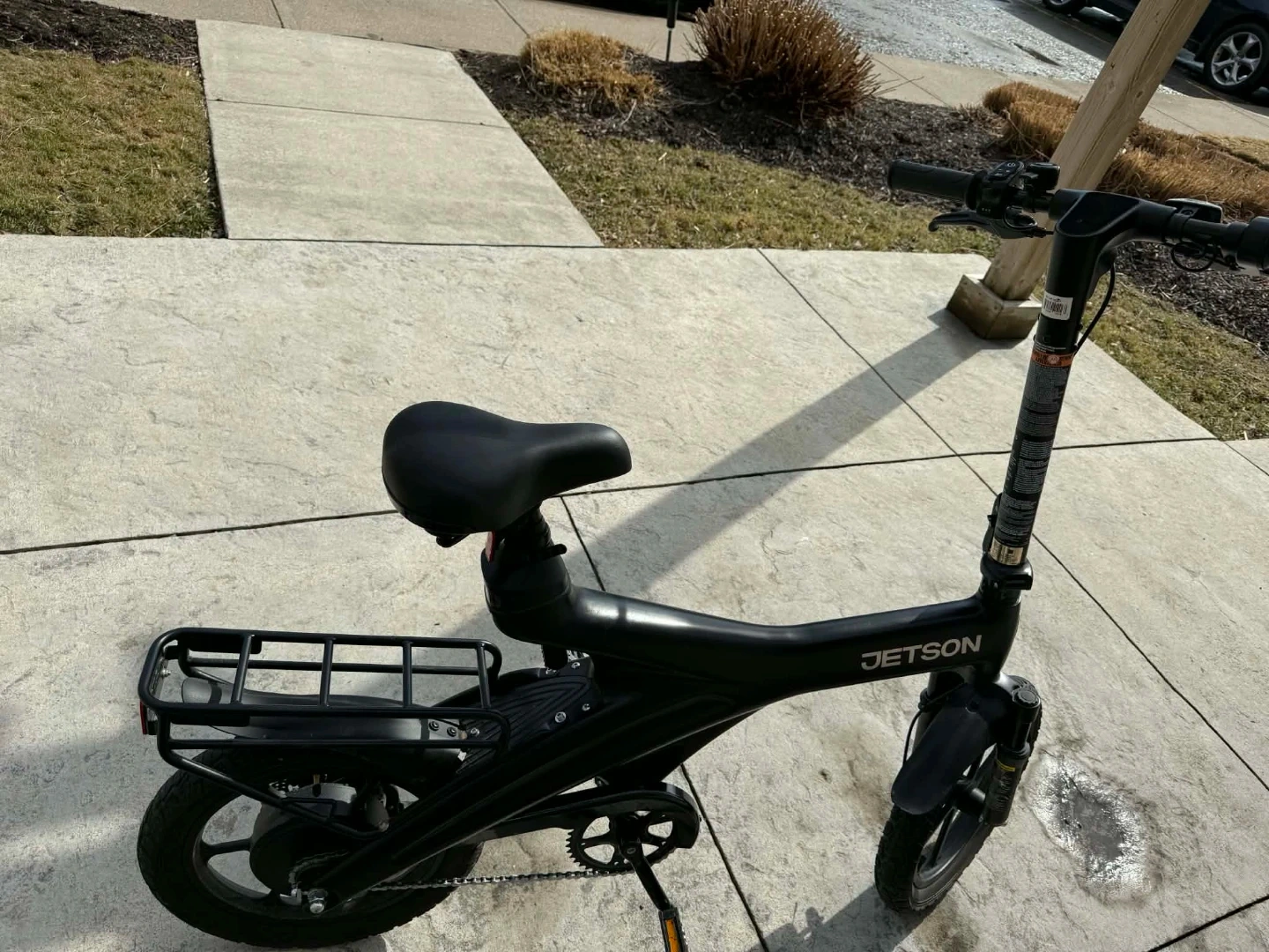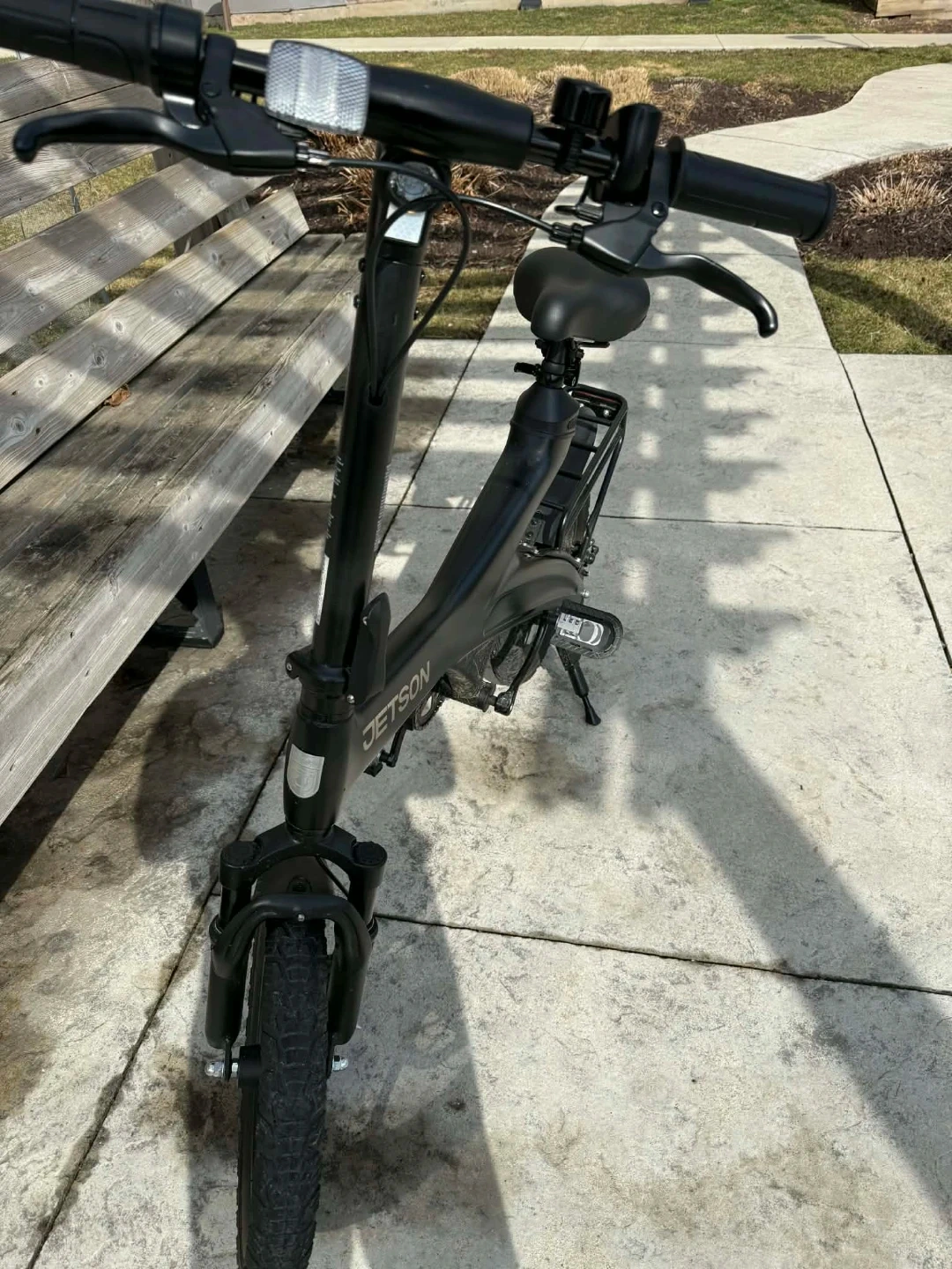 Jetson electric folding bike in black. It's a compact commuter option. Great for getting around town quickly and easily!