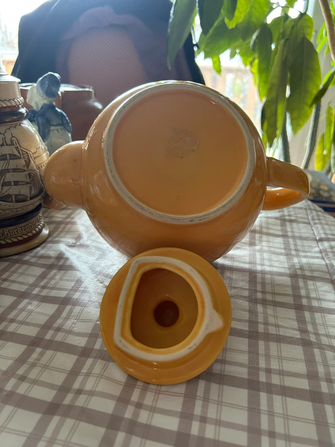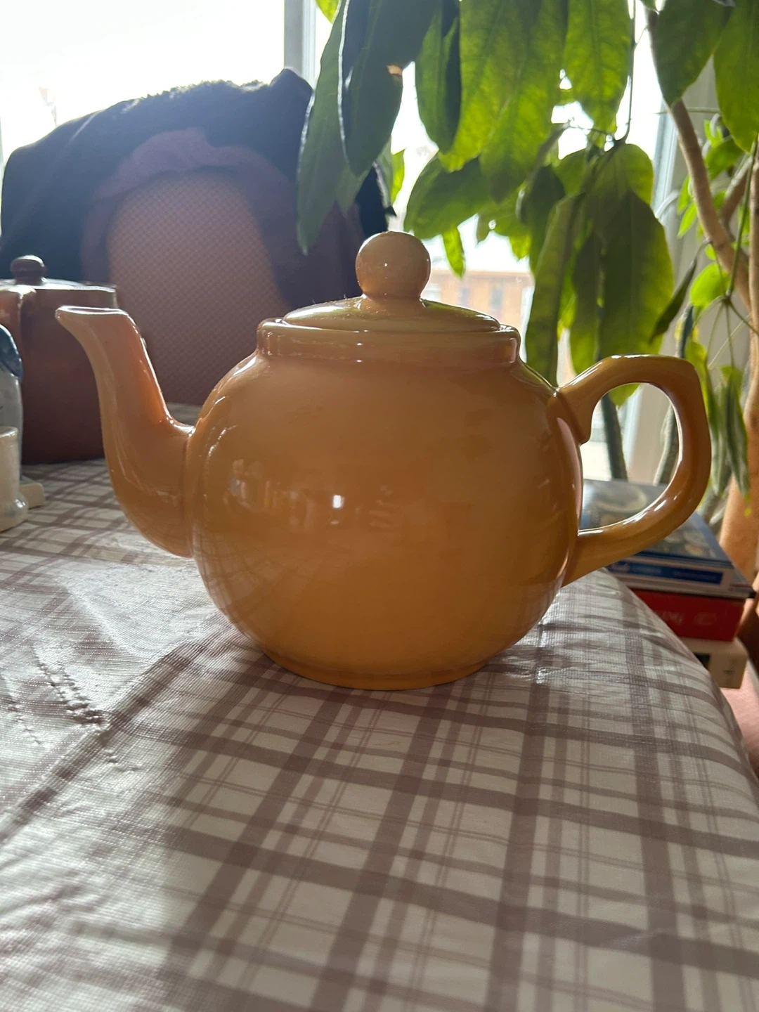Selling a lovely yellow teapot in a vintage style! It's in great condition and would be perfect for tea time or as a decorative piece in your kitchen. It's a sunny yellow colour, and comes with a matching lid.