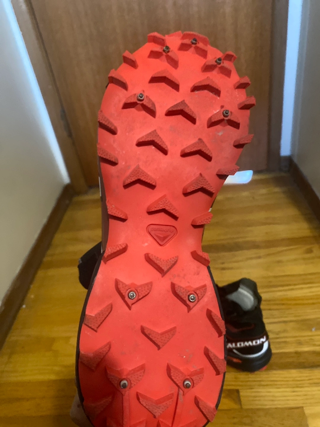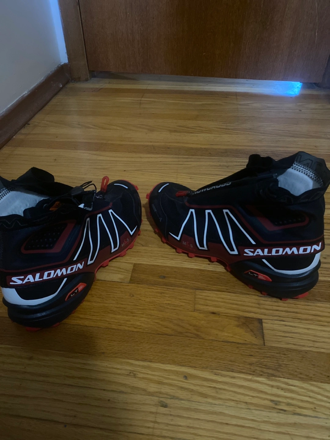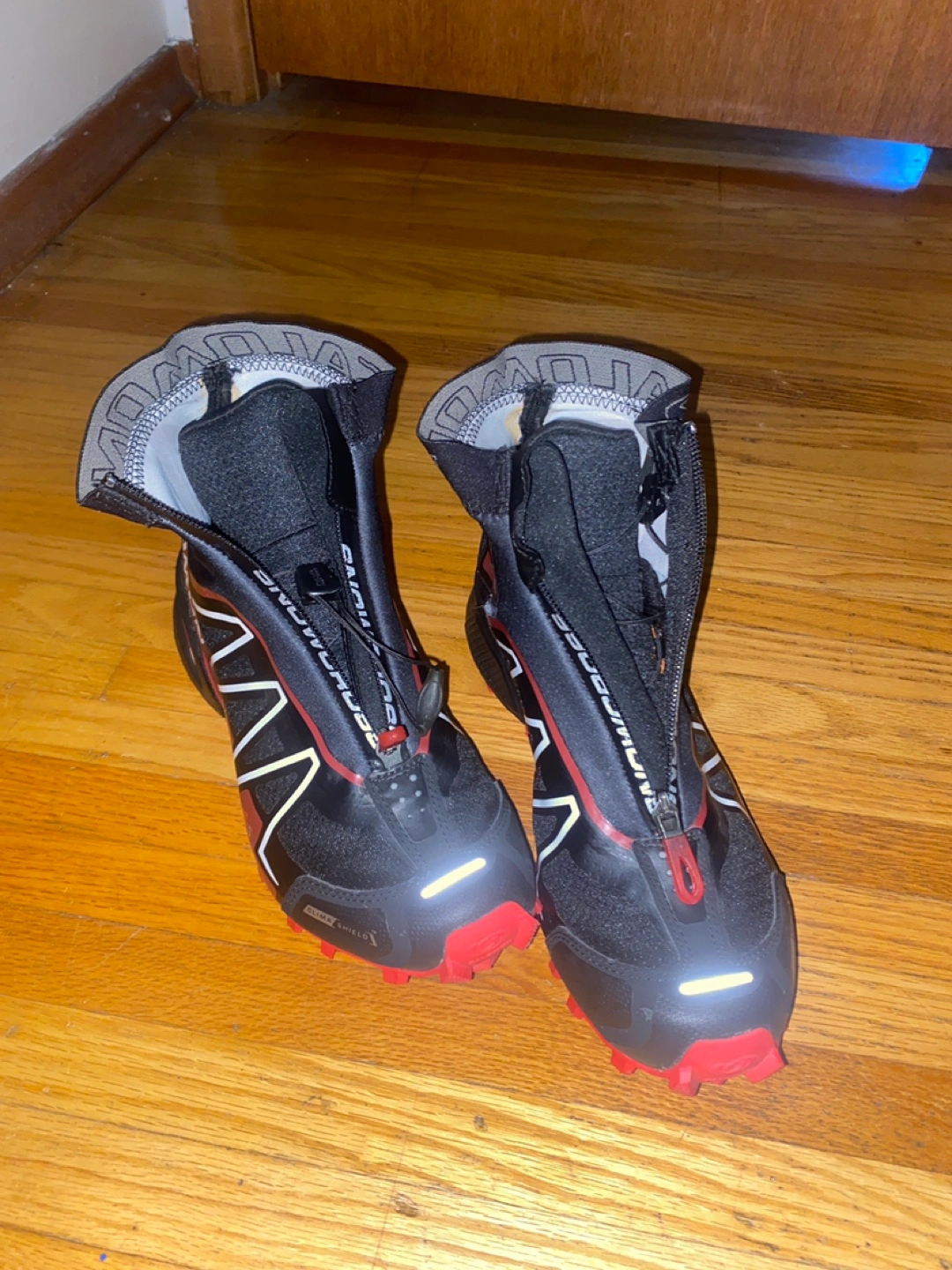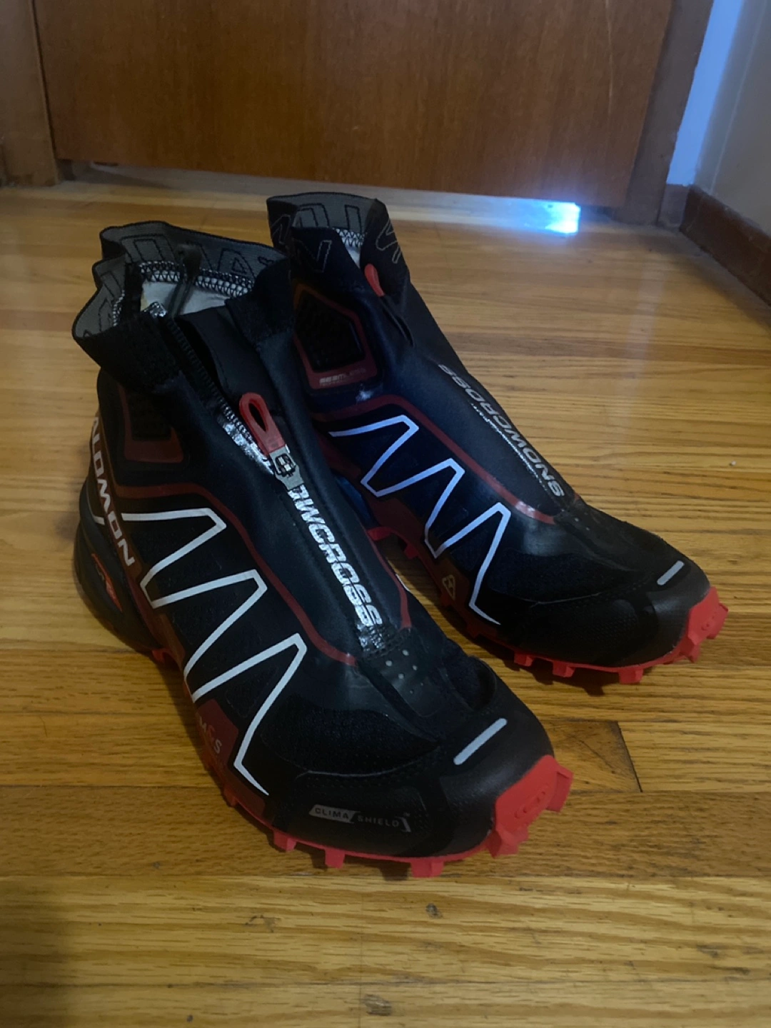 Selling a pair of Salomon Snowcross trail running shoes. They're designed for winter conditions and feature a zippered shroud to keep snow out. The soles have aggressive lugs for traction on icy trails. Great for winter running!