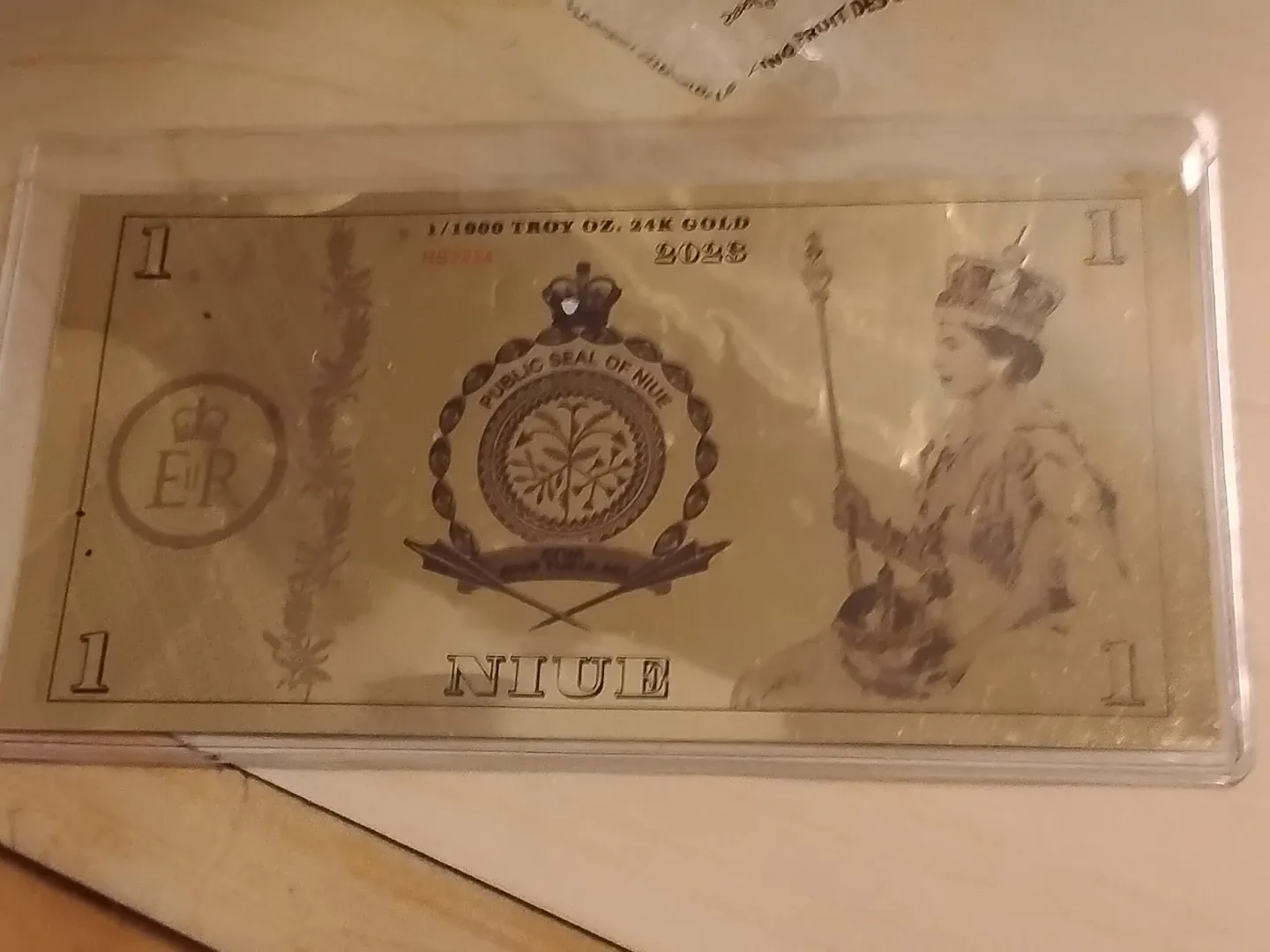 This is a 1/1000 troy ounce 24K gold note from Niue, dated 2023. It features "ER" and the Public Seal of Niue.
