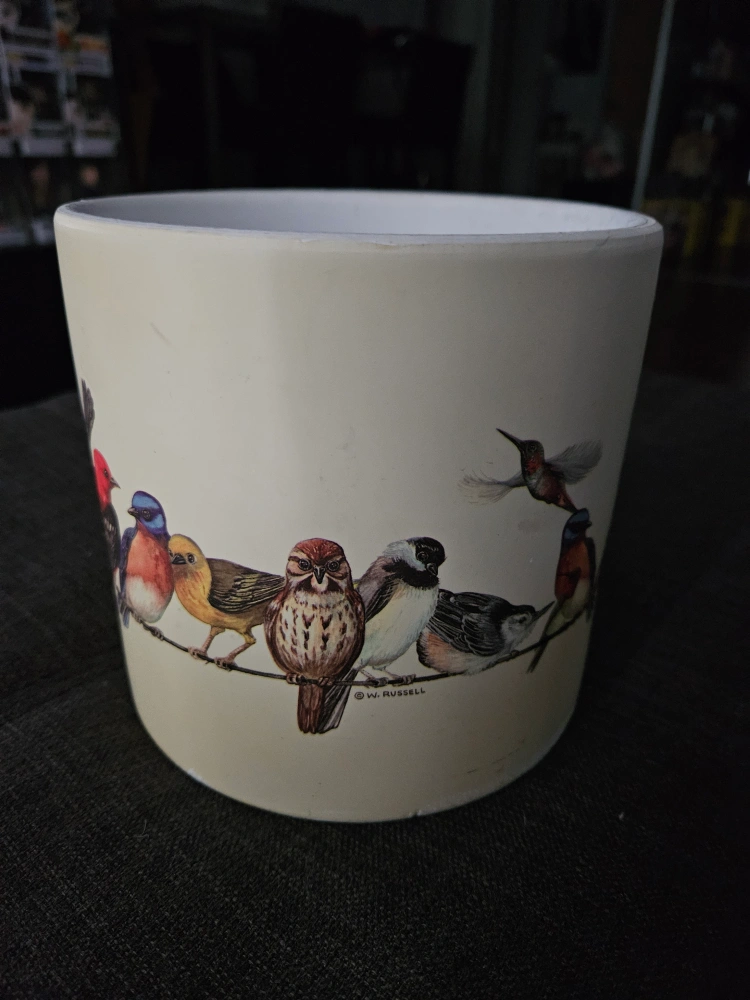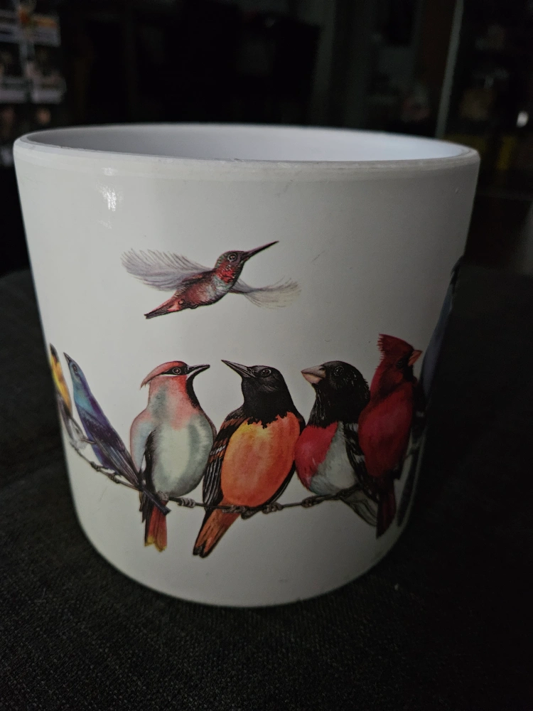 Features colourful bird illustrations. Suitable for small plants or succulents.