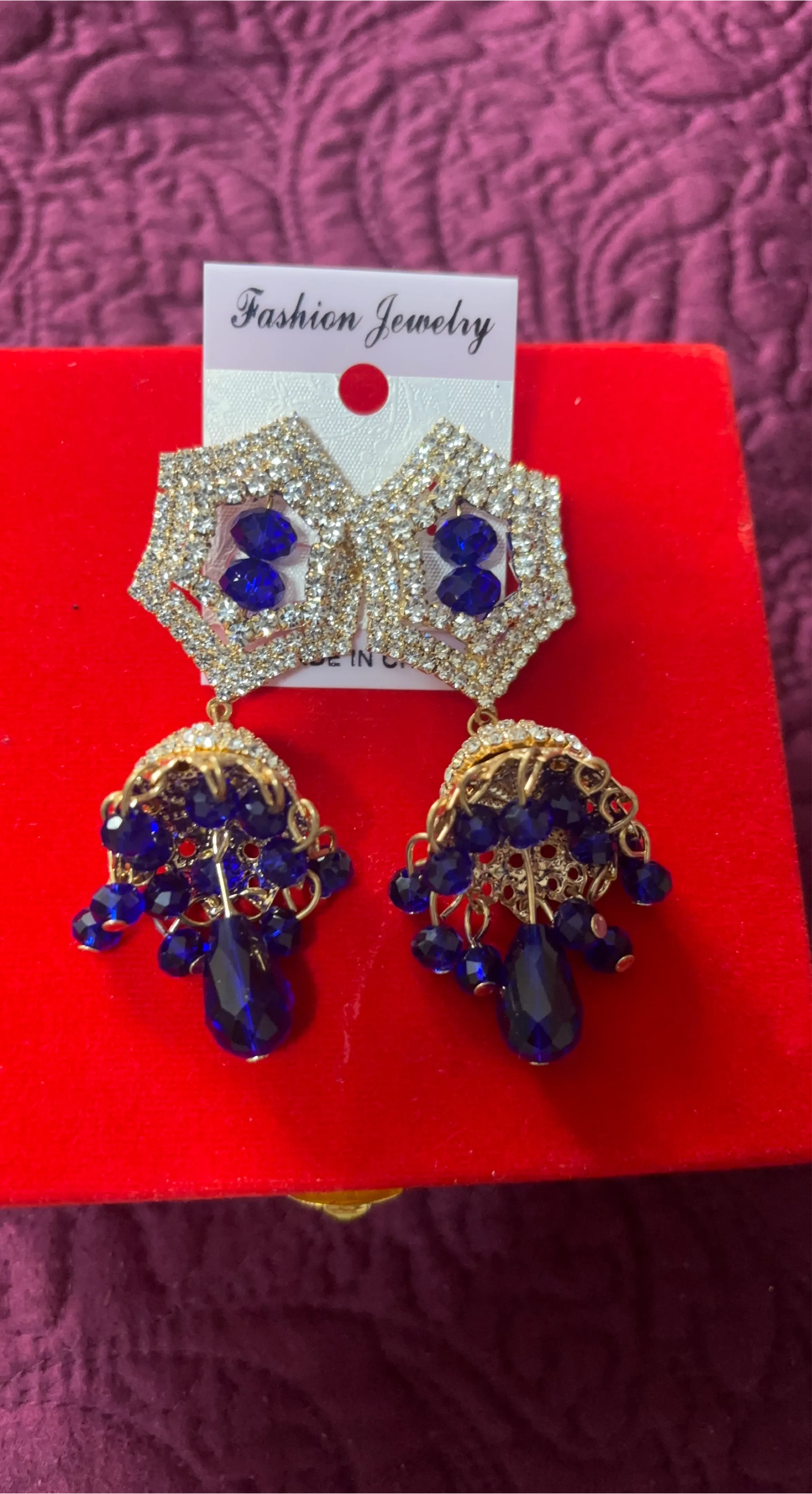 Beautiful gold-toned drop earrings featuring sparkling clear gems and deep blue faceted stones. They're lightweight and perfect for adding a touch of elegance to any outfit. A great accessory for special occasions or everyday wear!
