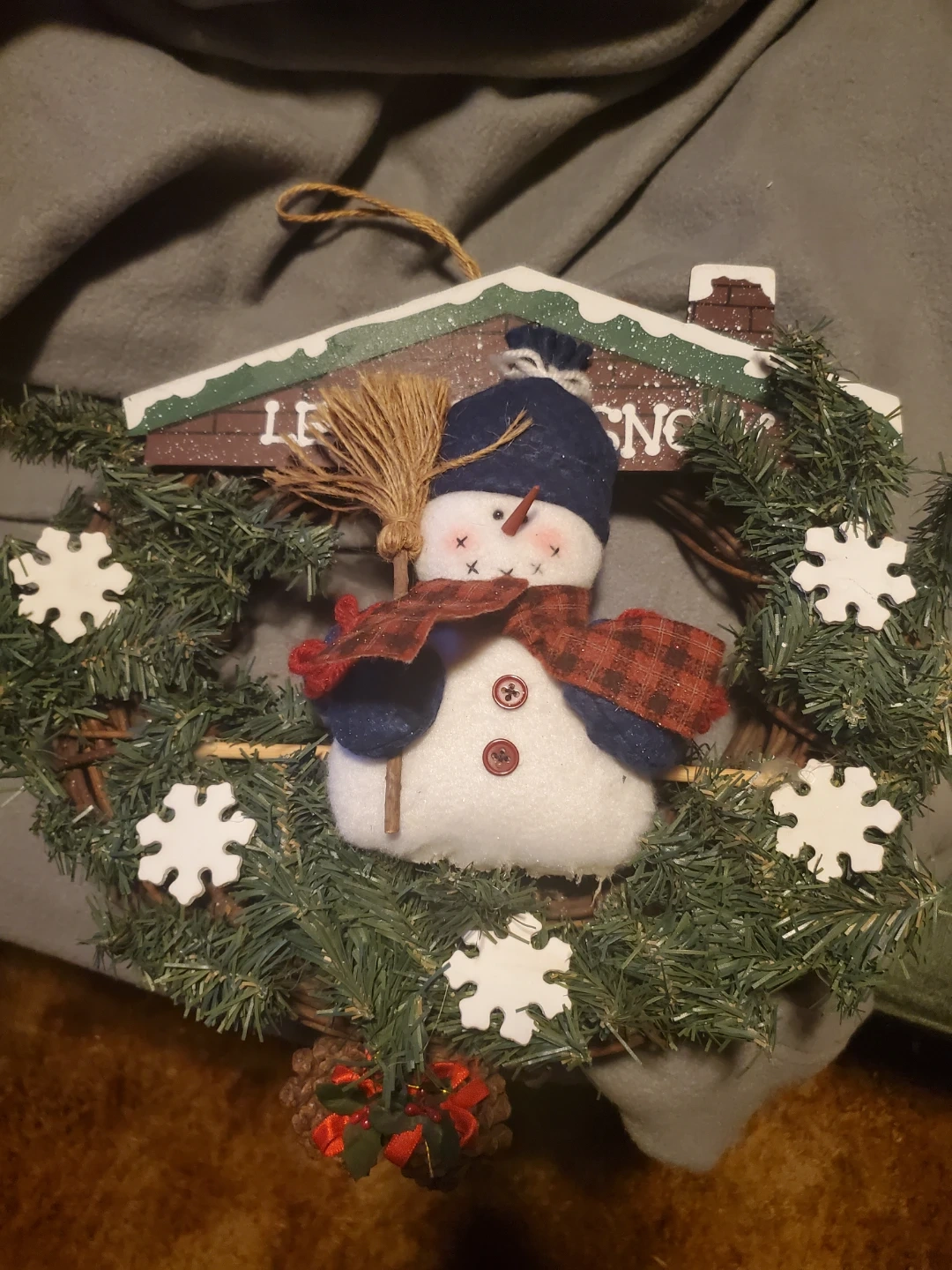 This is a cute snowman wreath decoration! It features a snowman figure with a scarf and hat, surrounded by a wreath of twigs, pine needles, and snowflakes. It's perfect for adding a touch of winter charm to your home. In great condition. Northend St. Catharines. Smoke free home. 15$