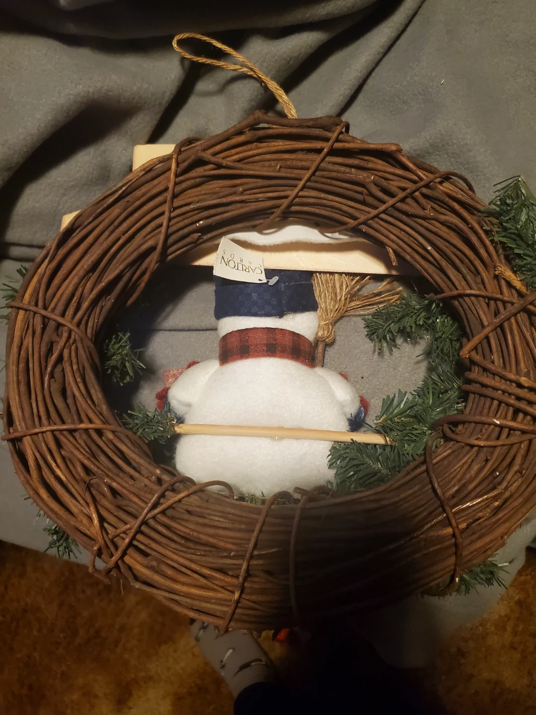 This is a cute snowman wreath decoration! It features a snowman figure with a scarf and hat, surrounded by a wreath of twigs, pine needles, and snowflakes. It's perfect for adding a touch of winter charm to your home. In great condition. Northend St. Catharines. Smoke free home. 15$