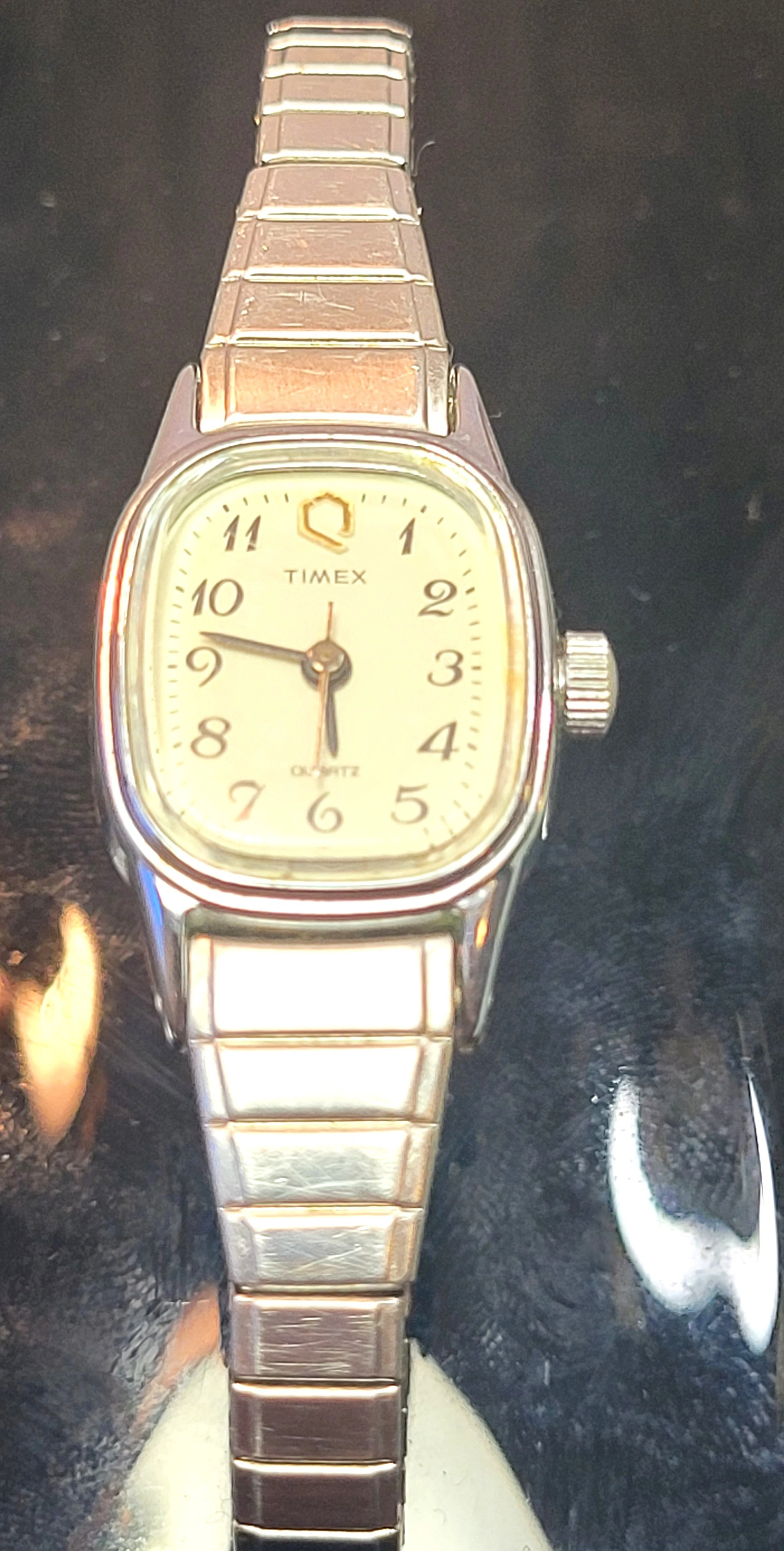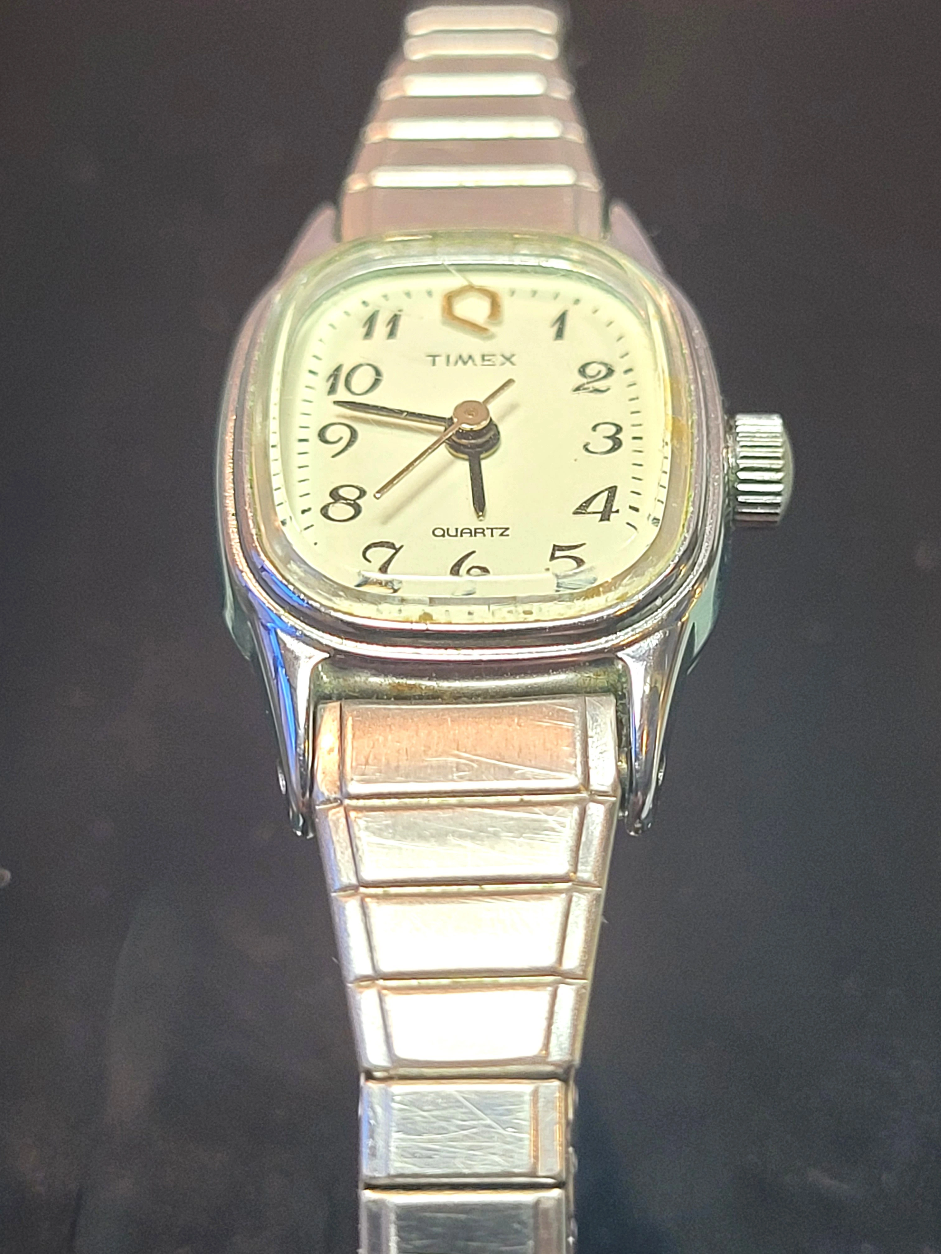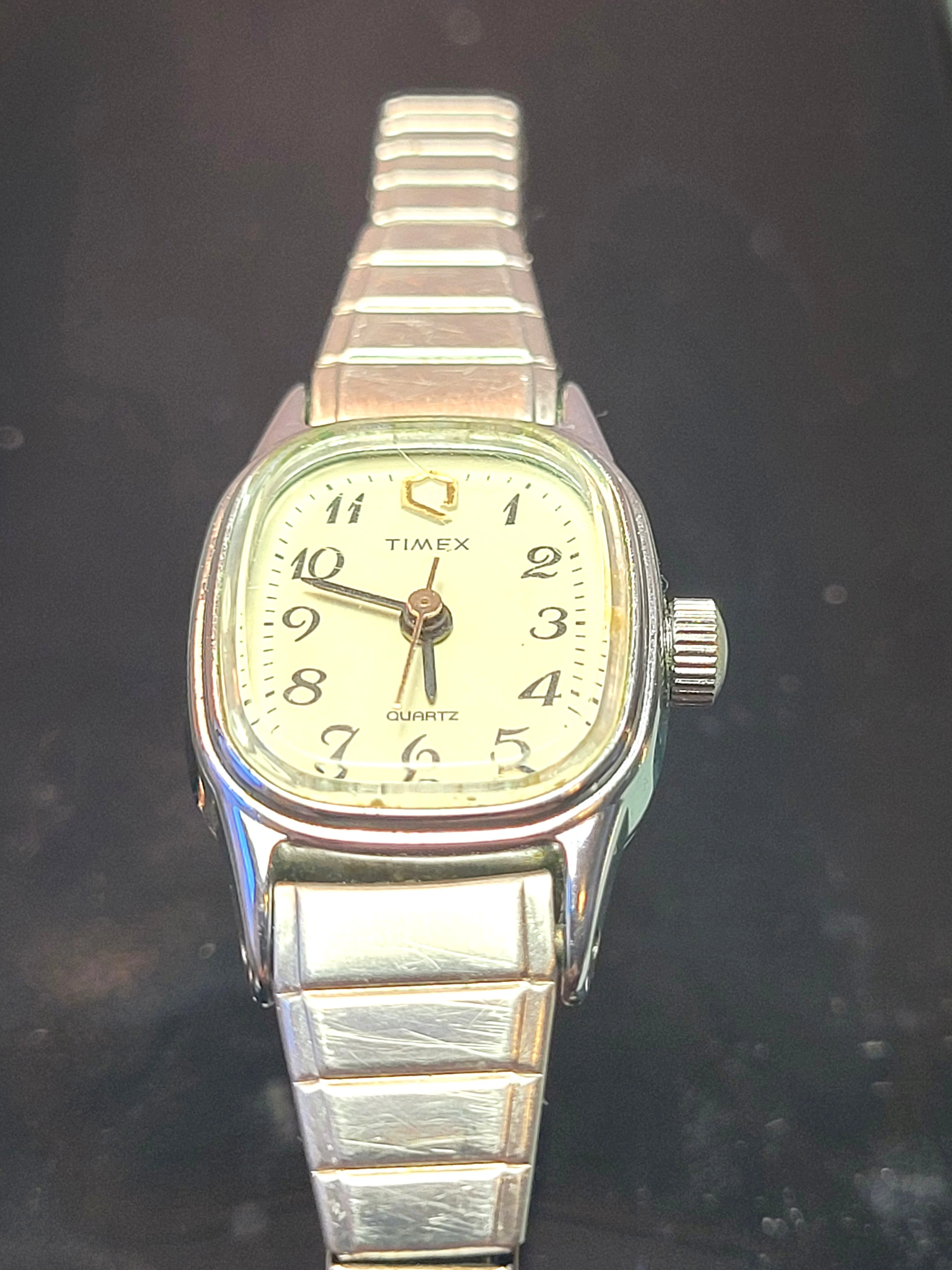 Sharp, vintage Timex Q Ladies Quartz watch in a sleek silver-tone finish. This is the classic Expansion Band that is both a timepiece and a piece of jewelry. Minimalist, durable, and ready for daily wear.