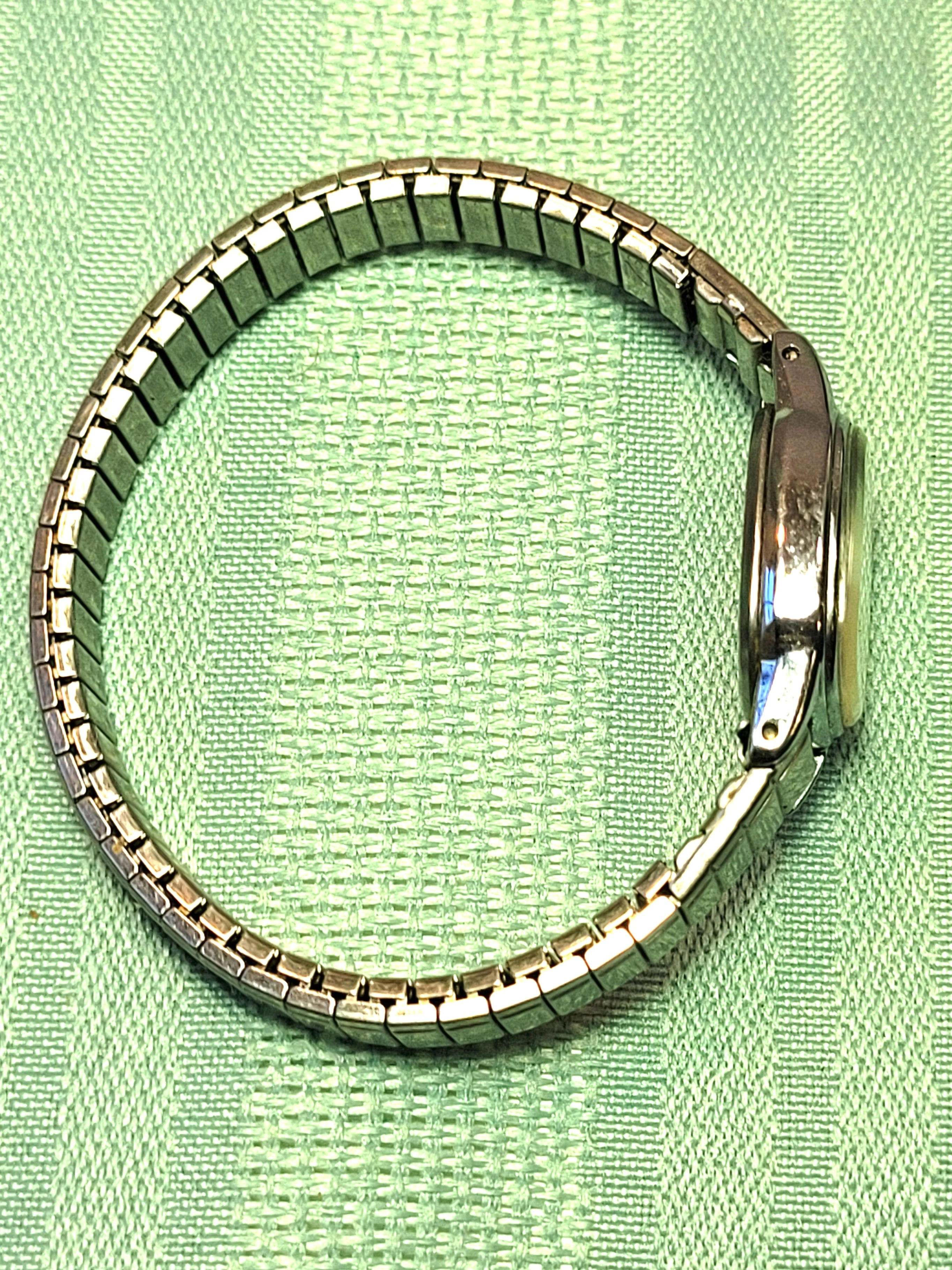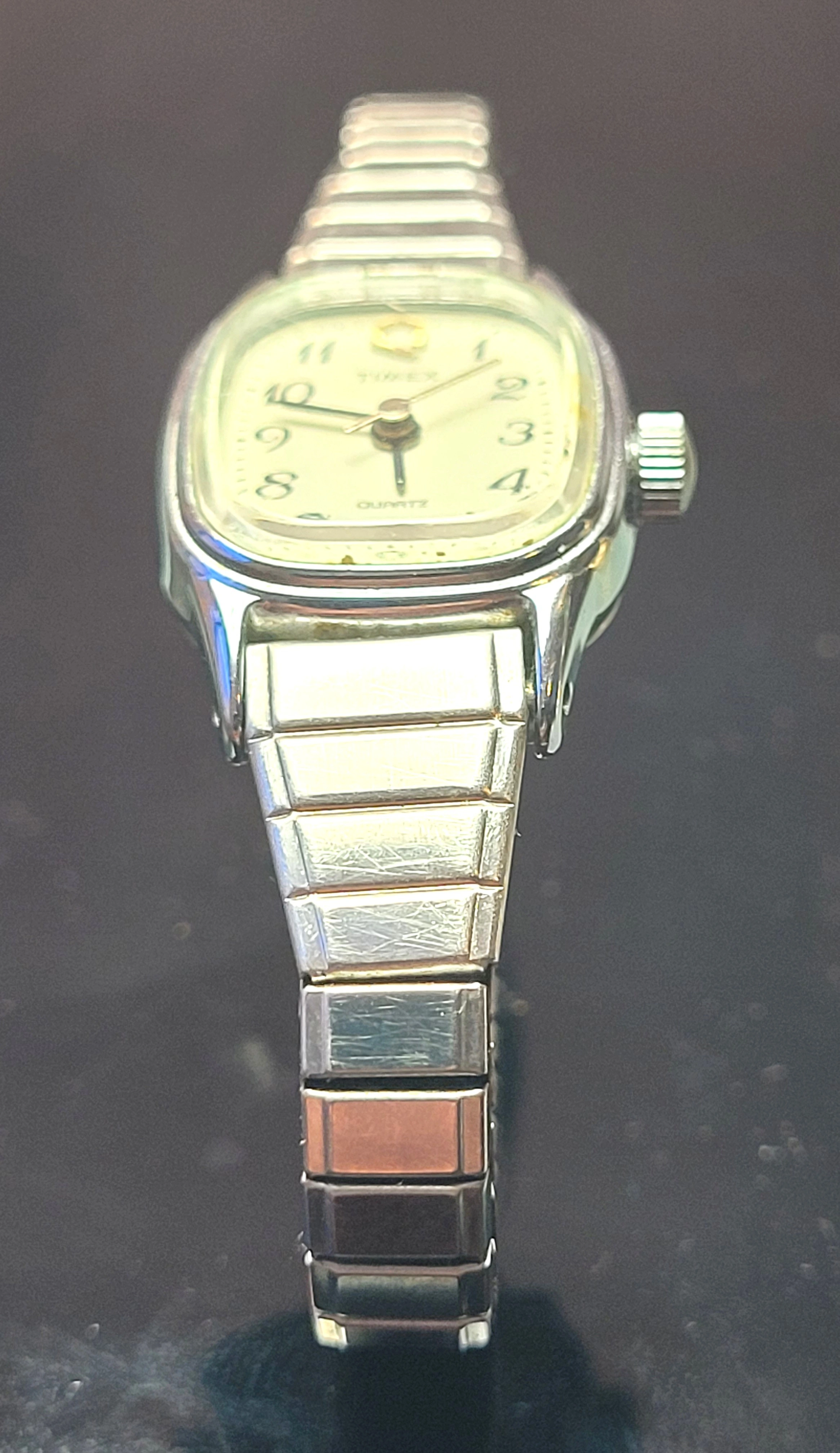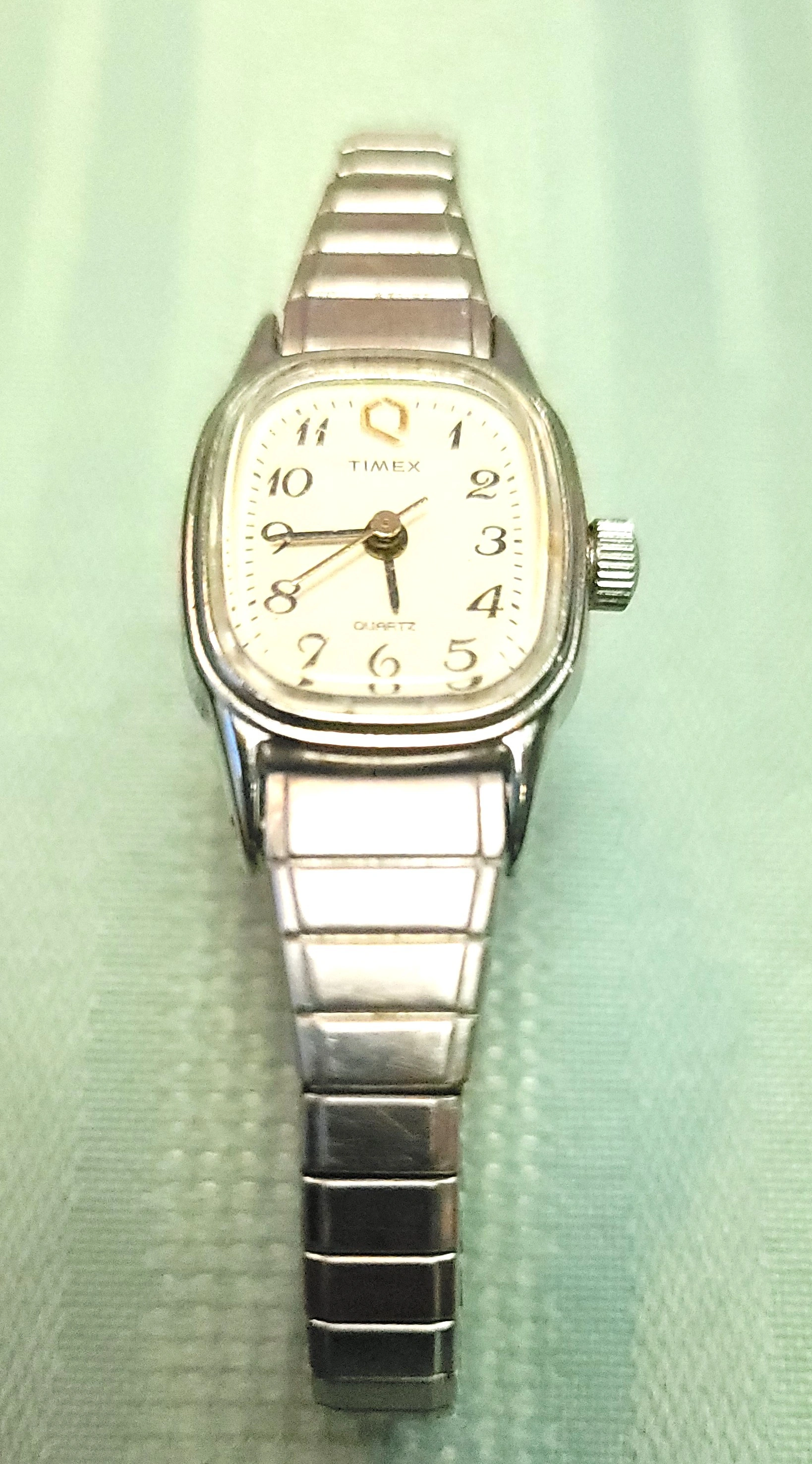 Sharp, vintage Timex Q Ladies Quartz watch in a sleek silver-tone finish. This is the classic Expansion Band that is both a timepiece and a piece of jewelry. Minimalist, durable, and ready for daily wear.