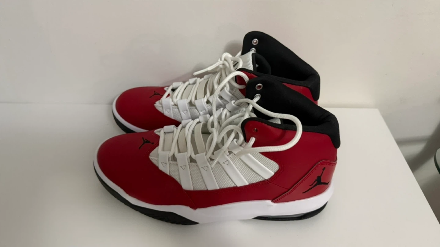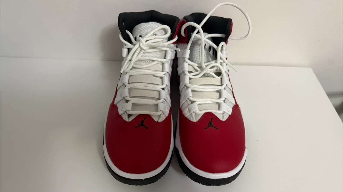 Men's high-top Jordan sneakers in red, white, and black. Lace-up closure with rubber sole. These kicks are ready for the court or casual wear!