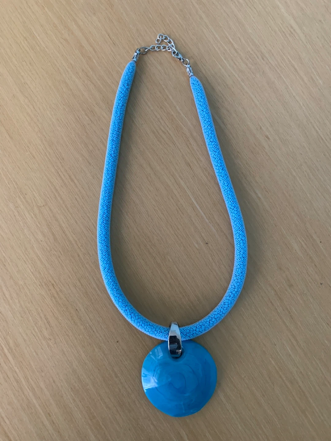 Light blue cord necklace with a round, swirled blue pendant, small beads inside. The pendant has a glossy finish and a metal clasp secures the necklace. It's a stylish accessory that adds a pop of colour to any outfit.