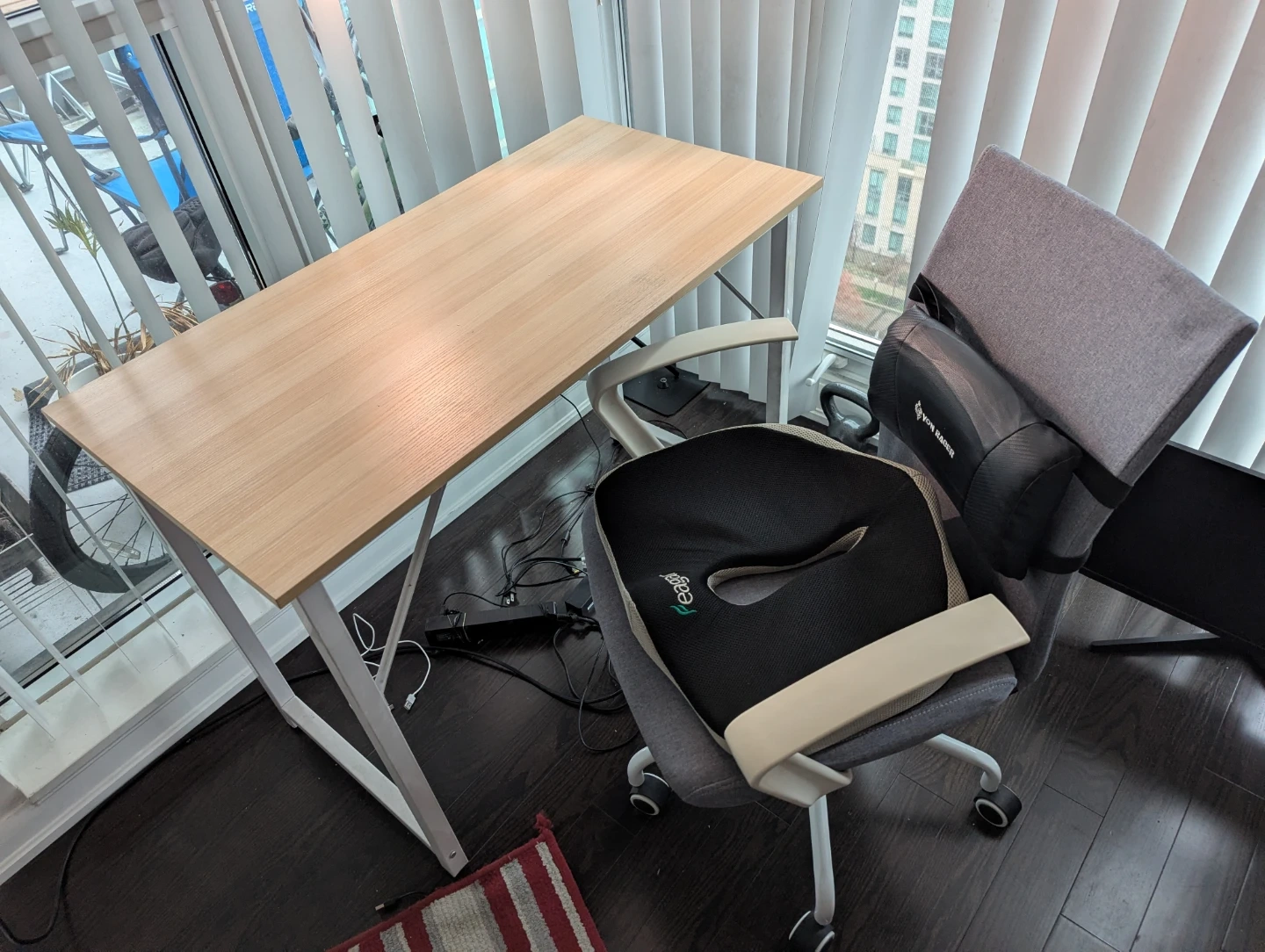 Selling a desk and office chair in good condition. Perfect for a home office setup or student workspace. The chair has a back support cushion for extra comfort while you work or study