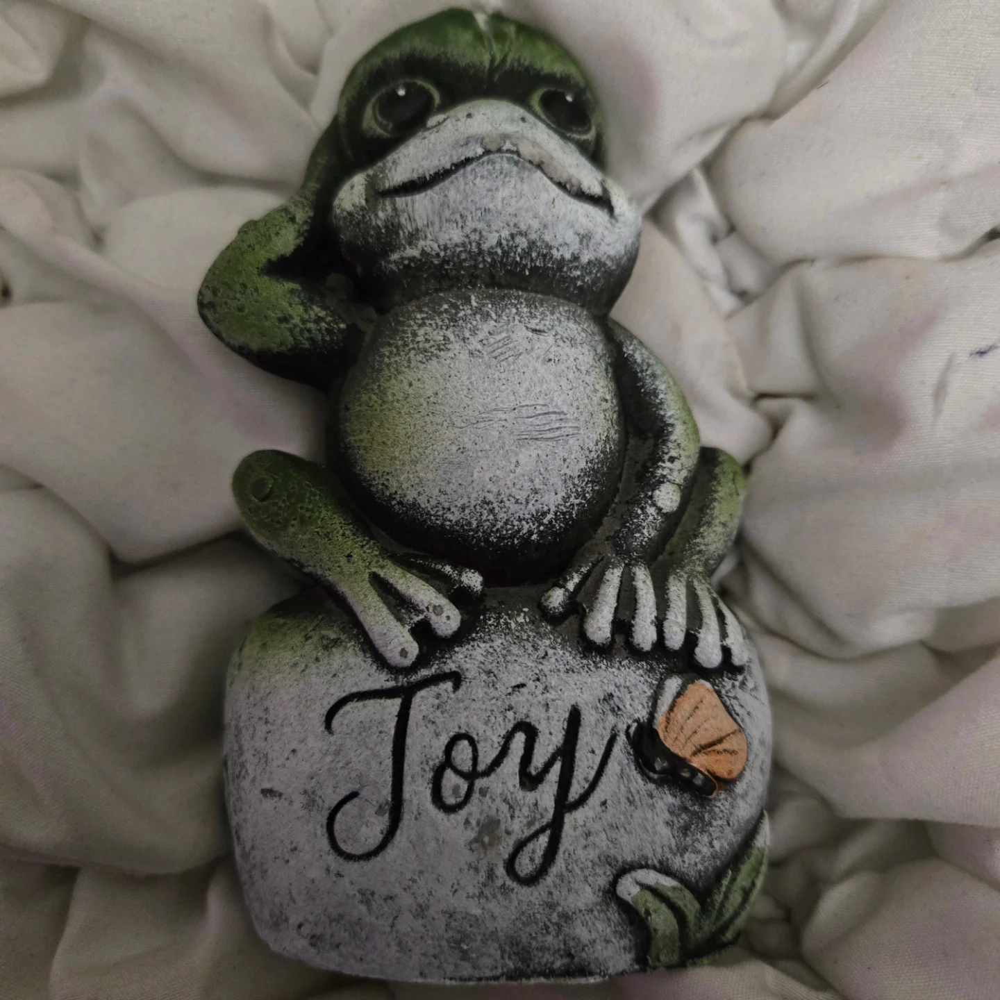 This cute frog garden statue is ready to bring some joy to your space! It's a fun decorative piece for your lawn or garden. The statue features the word 'Joy'. Originally bought for $3.