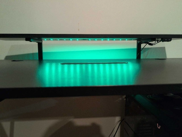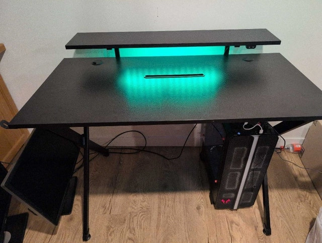 Get ready to level up your gaming setup with this Staples gaming desk, complete with awesome LED lights! This used desk is in great condition and ready to enhance your gaming experience. Key features include: Spacious surface area for your monitor, keyboard, and mouse. Integrated LED lighting with multiple colour options. Sturdy construction for long-lasting durability. Built-in shelf for a clean look and maximized desk space. Cash accepted.