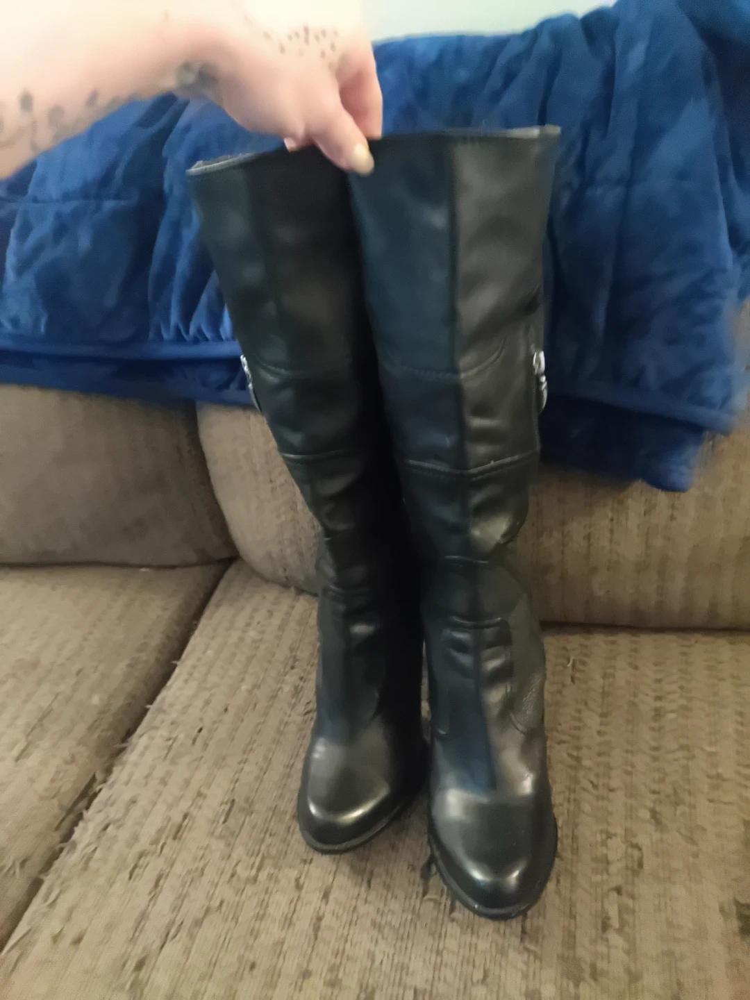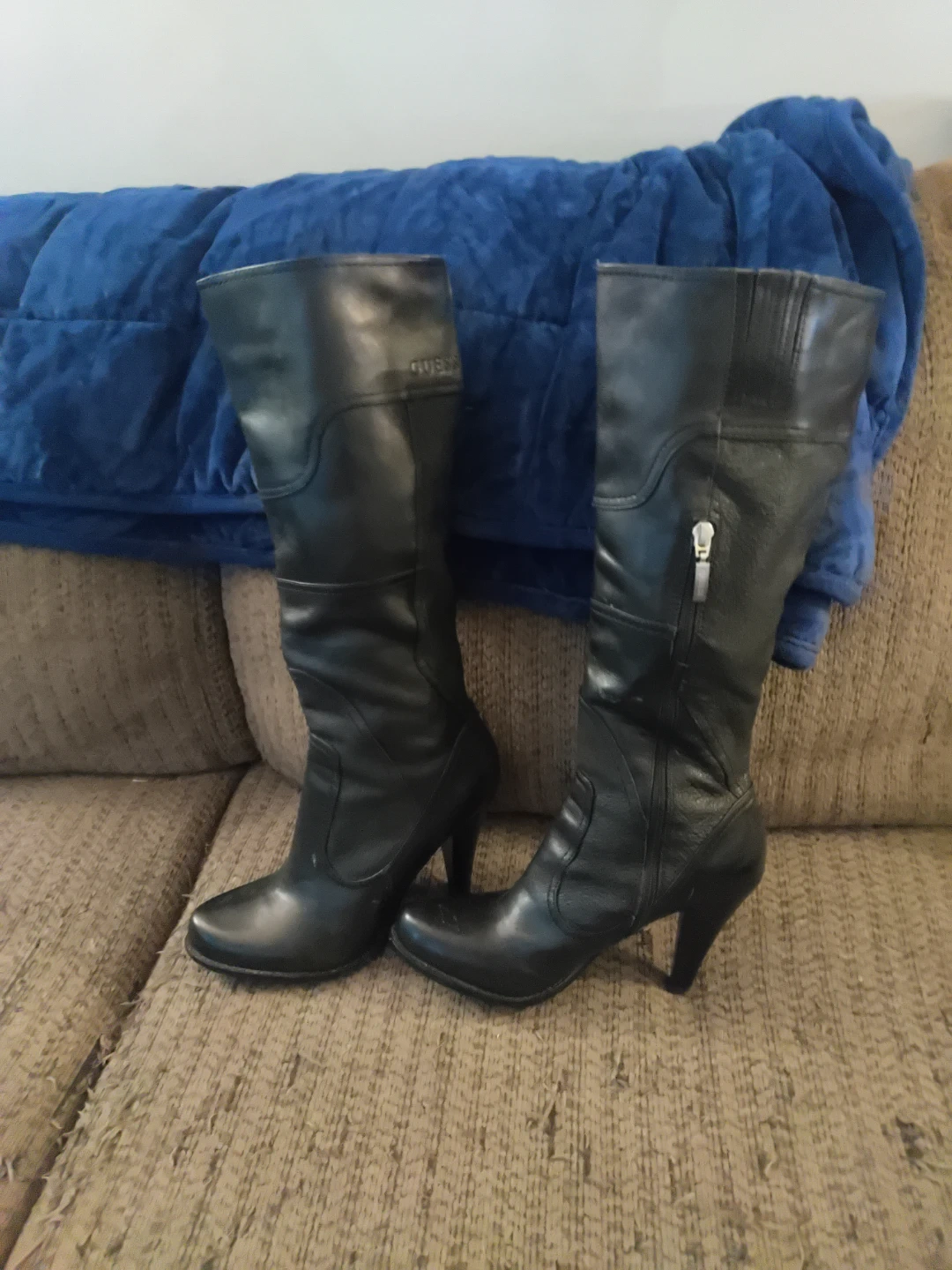 These Guess boots are made from black leather. They feature a knee-high design with a side zipper for easy wear. A stylish heel adds a nice touch.