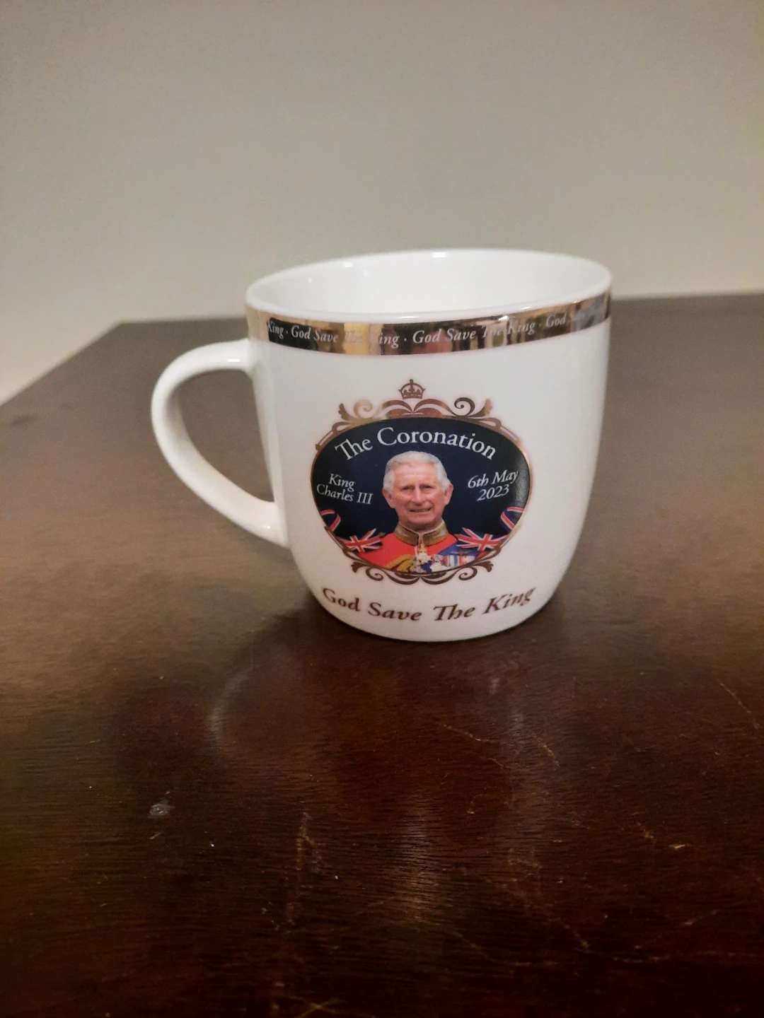 A mug celebrating the Coronation of King Charles III on 6th May 2023. It features text around the rim that reads 'King, God Save The King'. Ceramic material. Holds a standard serving of beverage.