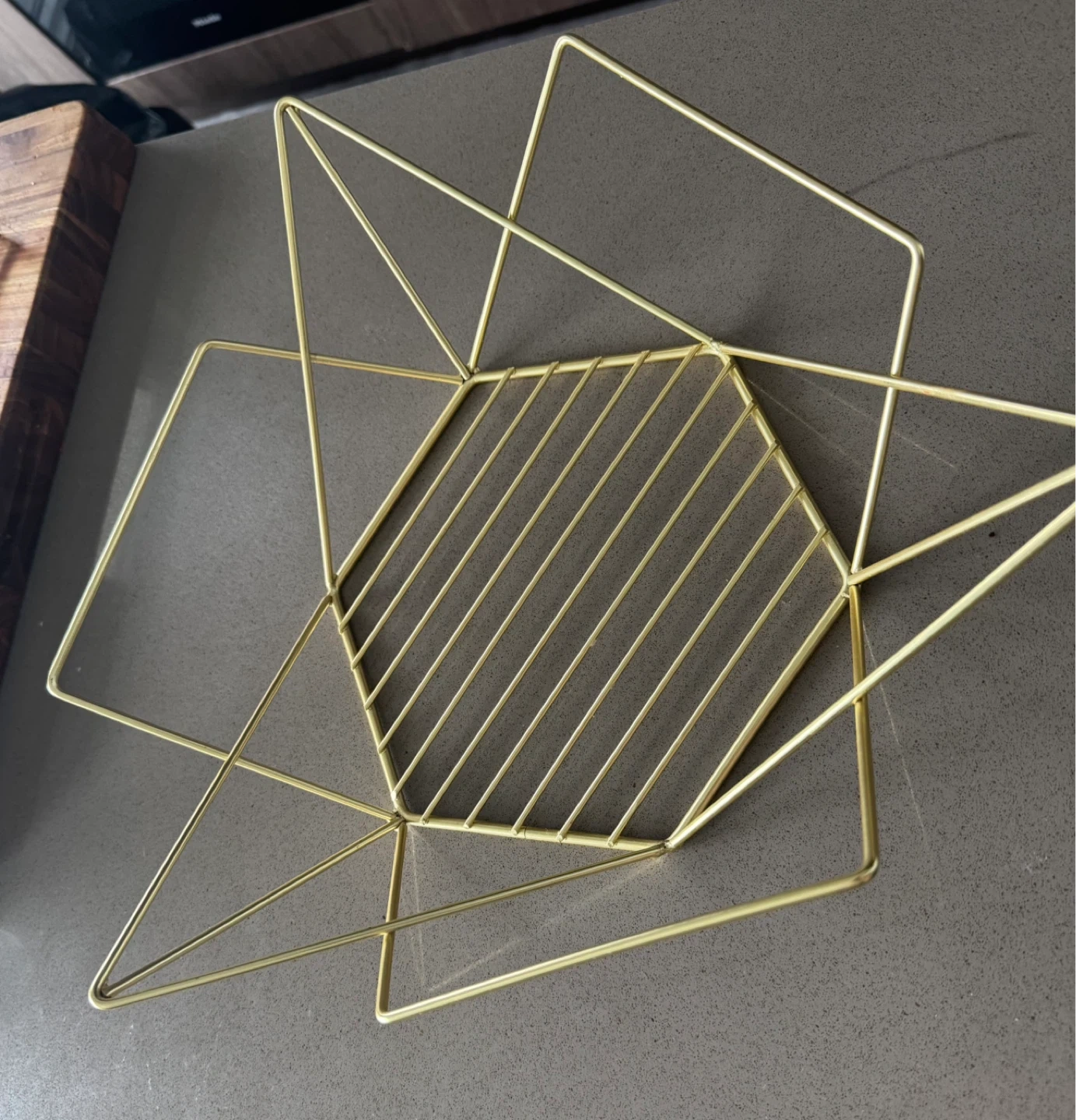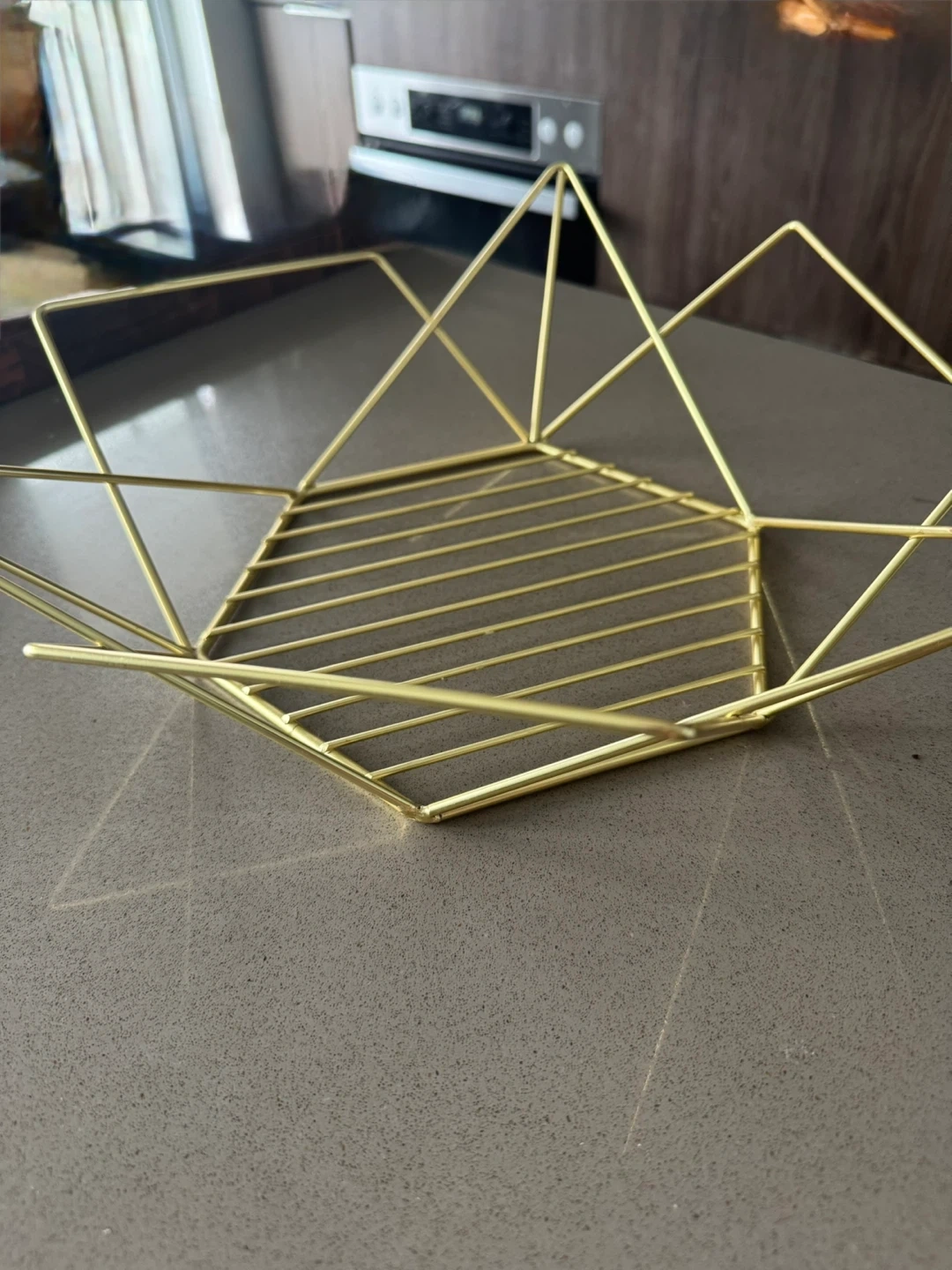 Stylish gold-tone wire fruit bowl with a modern geometric design. It's perfect for holding fruit on your countertop or table. Adds a decorative touch to any kitchen space! Light weight, fun addition to a kitchen table.