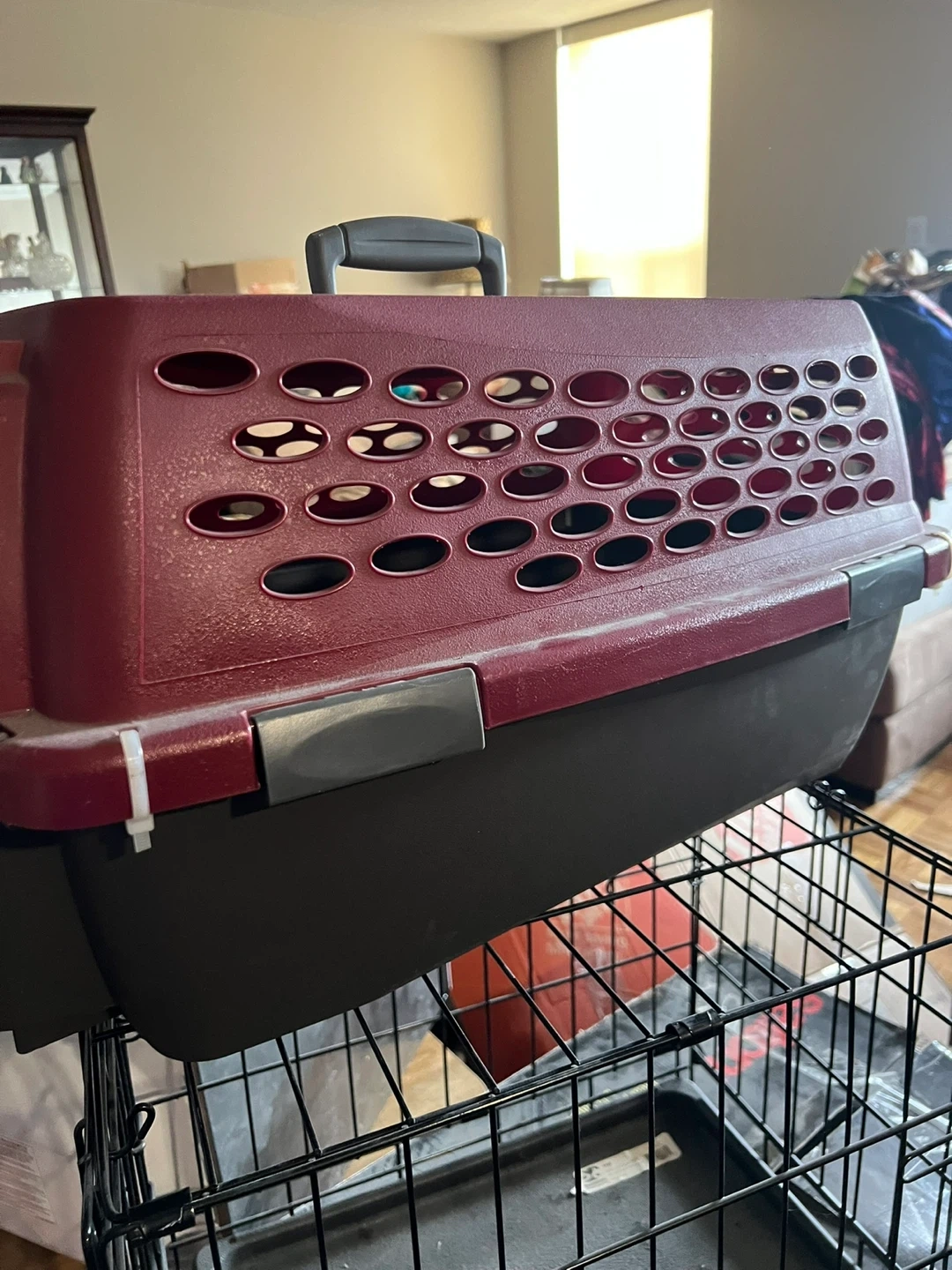 A sturdy pet carrier crate for small to medium-sized animals. It's made of durable plastic with ventilation holes for air circulation. The top handle makes it easy to carry. You must come and pick it up. There are a lot of stairs in this complex.
