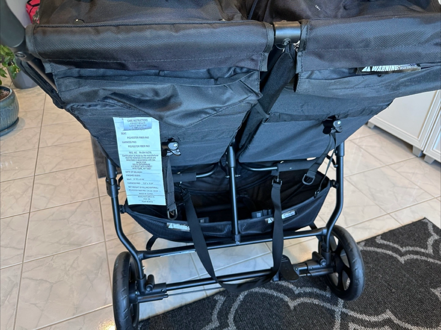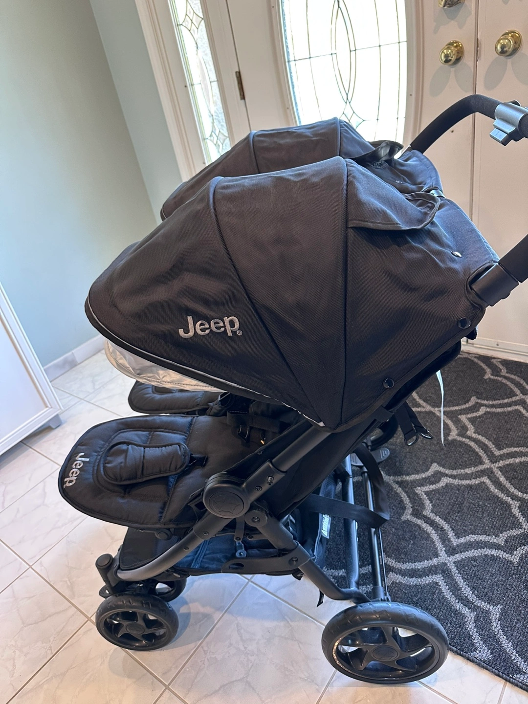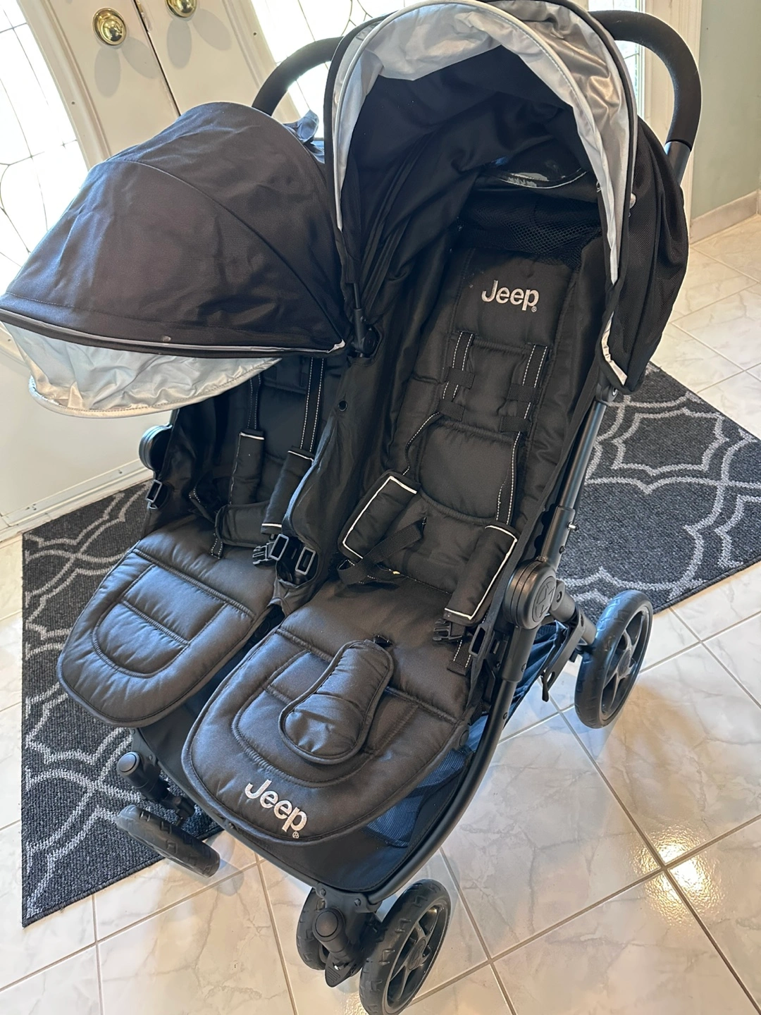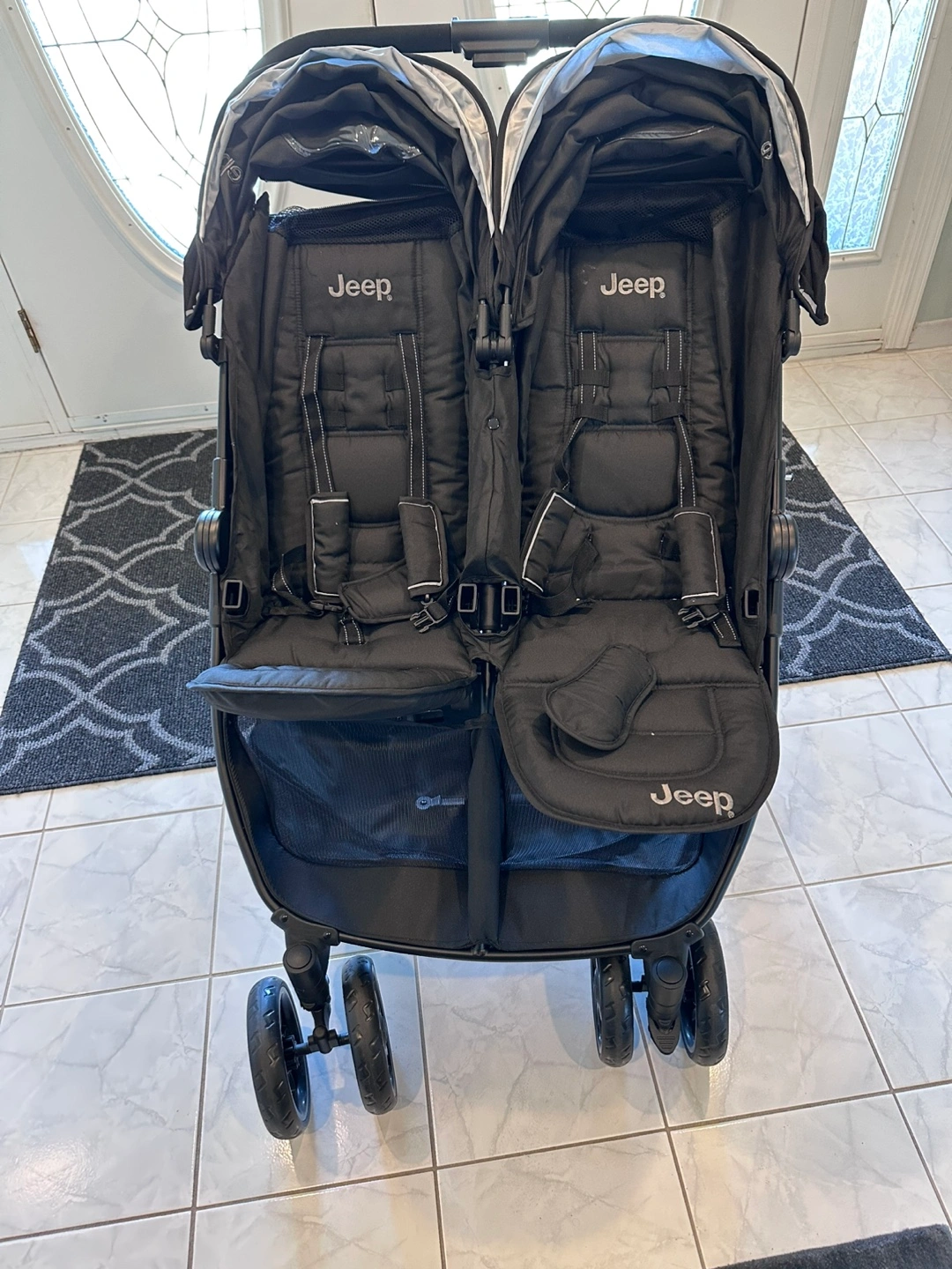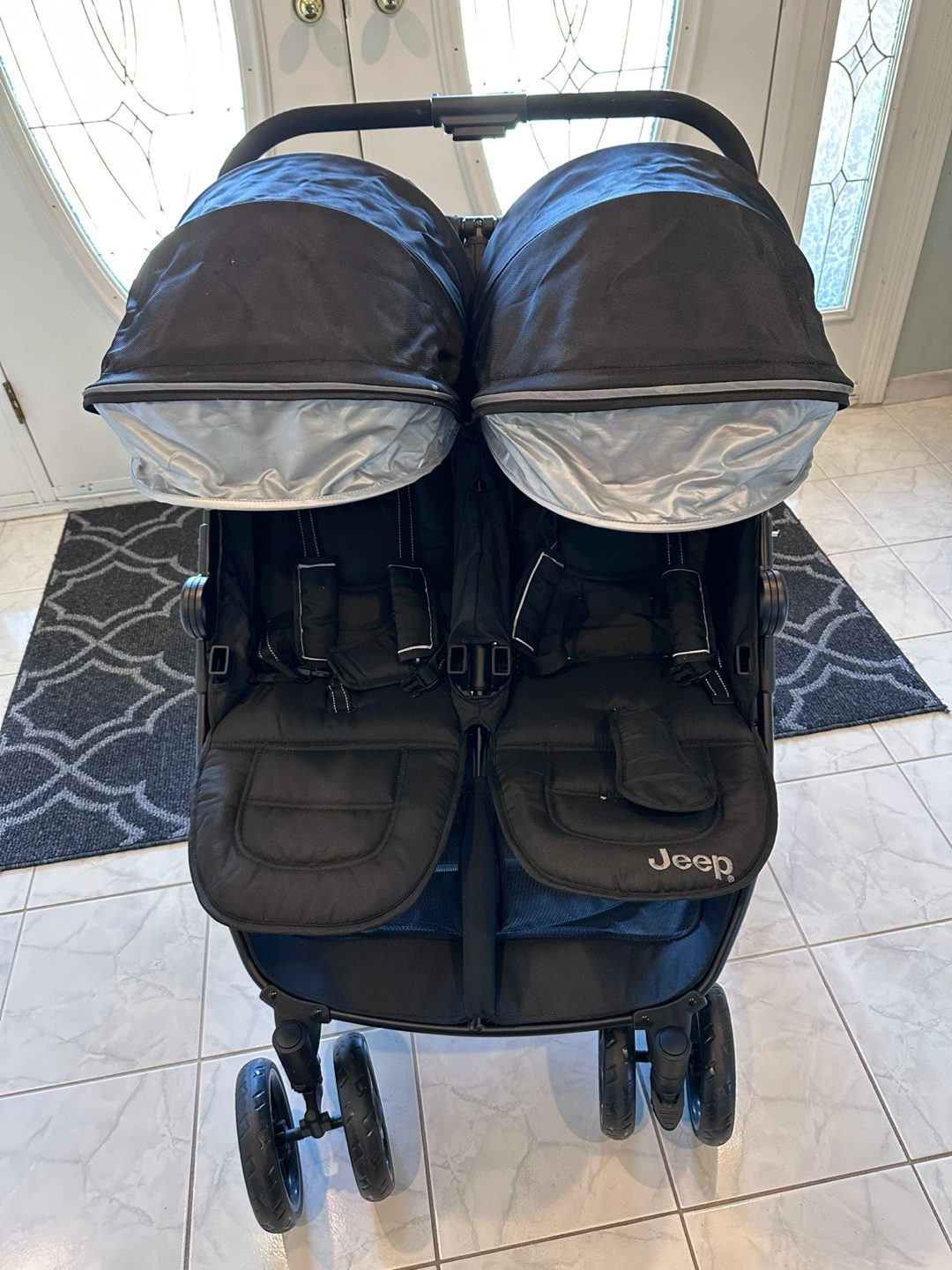 Black double stroller. Two individual canopies. Multiple storage pockets. Good conditions, just one time used for travel.