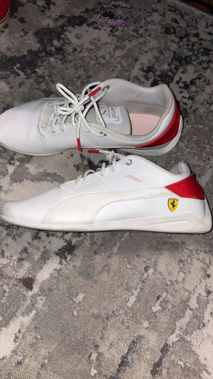 Selling a pair of Puma Ferrari Race sneakers in white and red! They are in great condition and are a US size 11.5. These sneakers have a sleek design and are perfect for everyday wear or showing off your love for Ferrari