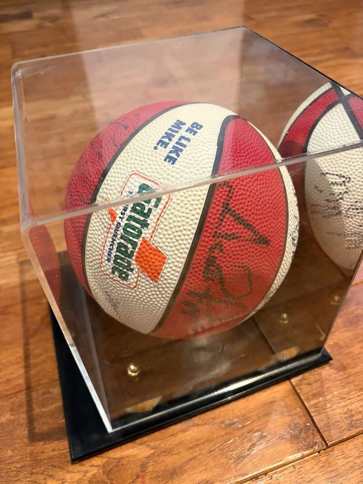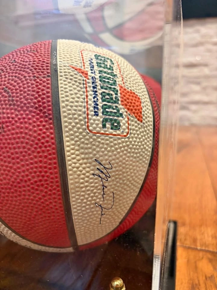 Rare 1990-91 Chicago Bulls team-signed Gatorade "Be Like Mike" promotional mini basketball from the Bulls' FIRST NBA Championship season. Displayed in a BDA Sports acrylic case with gold pedestal. Signatures include Michael Jordan, Scottie Pippen, Horace Grant, John Paxson, B.J. Armstrong, Stacey King, Will Perdue, Bill Cartwright, and possibly Craig Hodges. This ball was signed at the Bulls' post-championship celebration in 1991. A family member who worked for the Bulls organization was present and received the ball directly from players. This is not a dealer piece — it has been in one family since the night the Bulls won their first ring. Price reflects provenance and significance. Local pickup only in the Oakville, ON area. Or Best Offer.