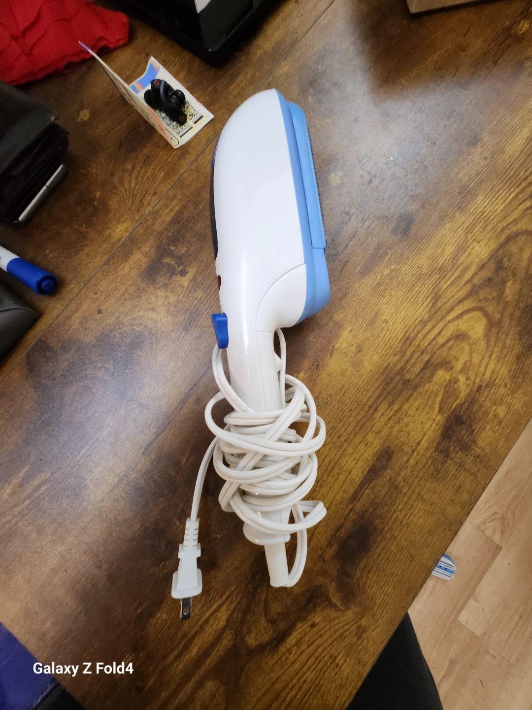 Selling a handheld clothes steamer in white and blue. It's in great condition and ready to help you get rid of wrinkles quickly and easily. Perfect for travel or quick touch-ups at home!