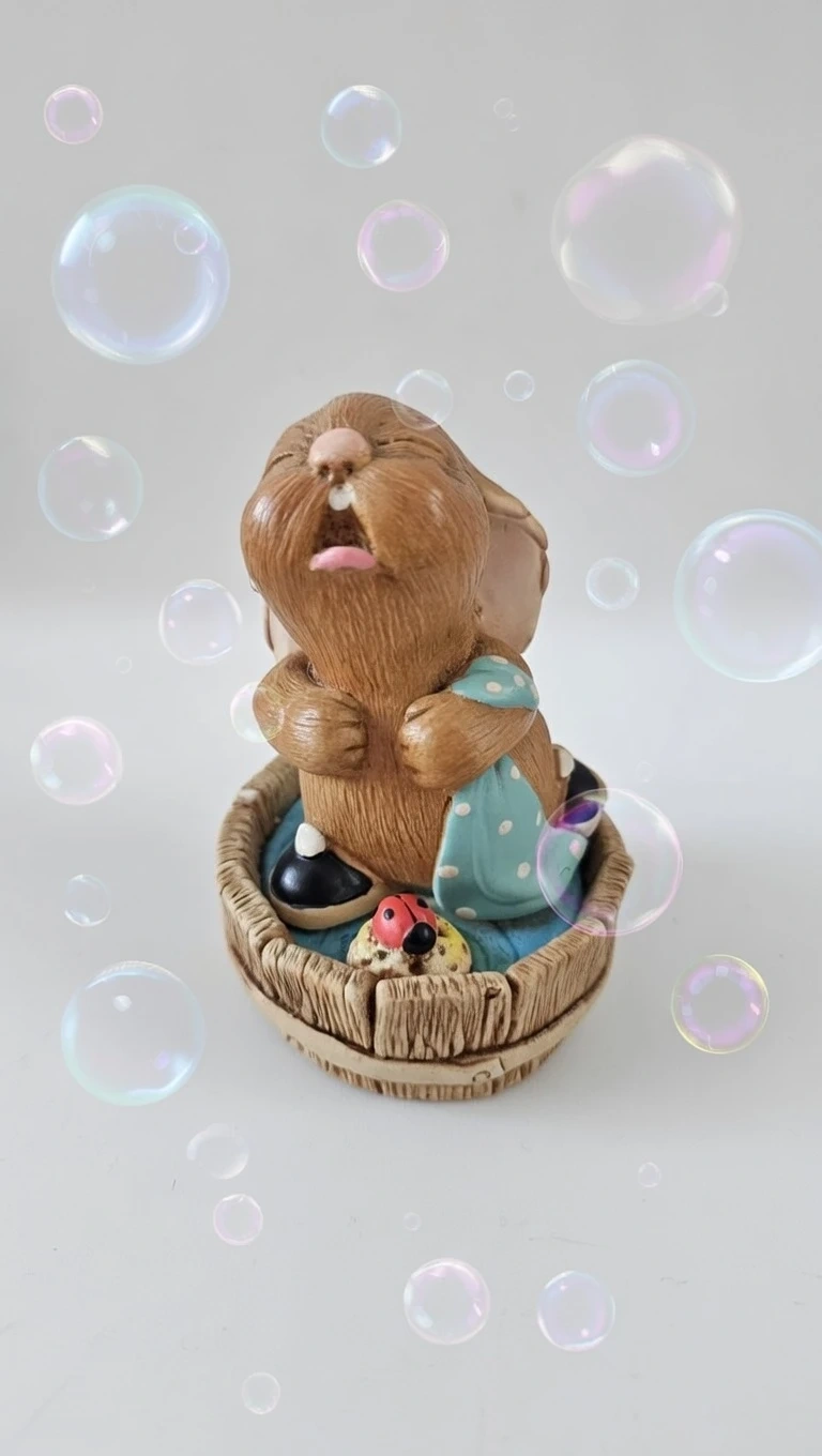 Pendelfin "Barney" figurine. Hand painted stonecraft by Pendelfin, made in England. It features a cute bunny in a tub with a ladybug. A charming collectible piece!