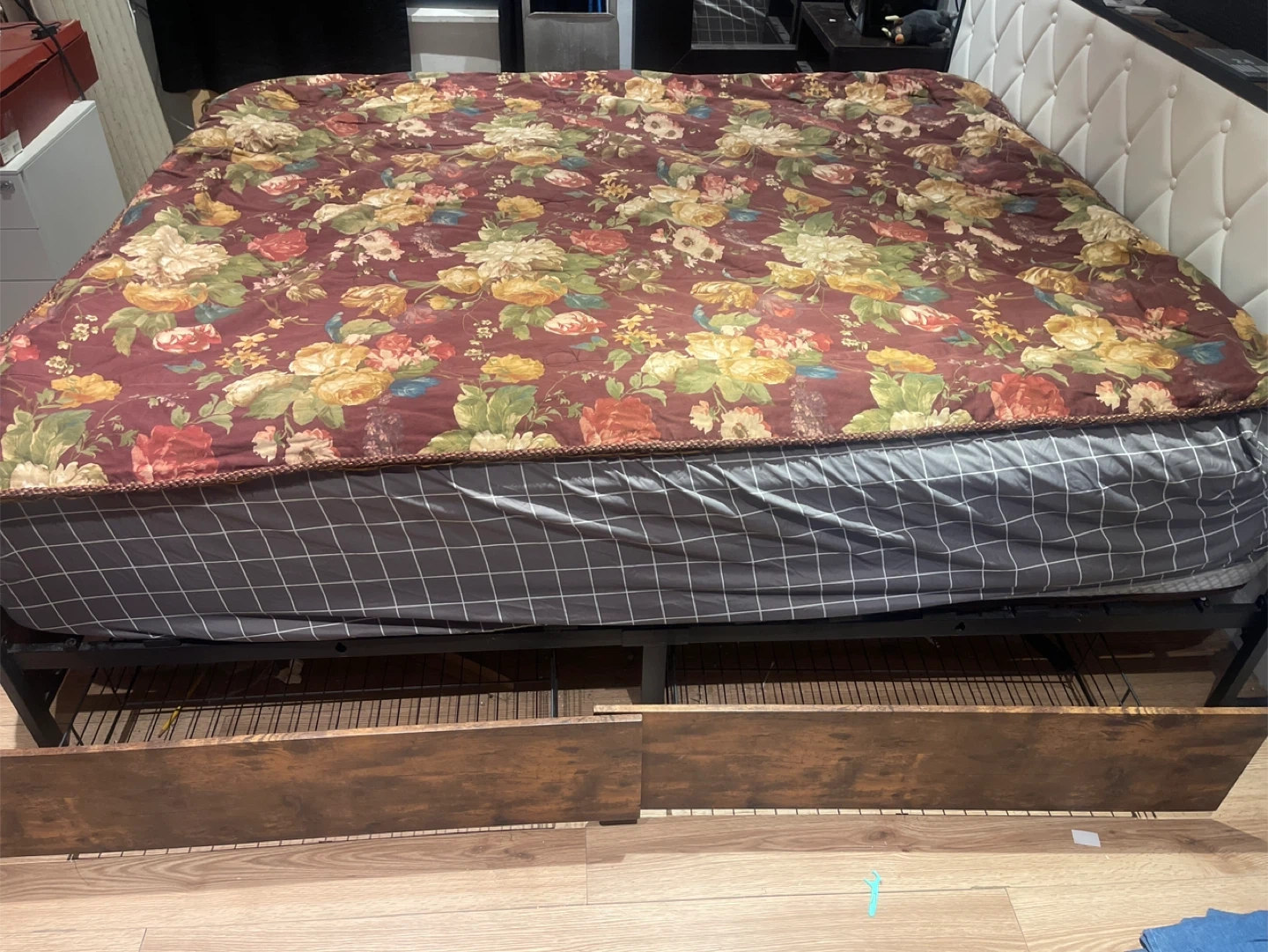 This is a lovely floral comforter set with a matching bed skirt. The comforter features a rich burgundy background with a beautiful all-over floral pattern. The bed skirt has a classic gray and white grid design. It's a great way to add a touch of charm plus 4 drawers to your bedroom!