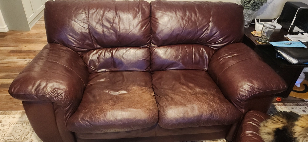 Comfortable brown leather sofa and loveseat set. Showing some signs of wear, particularly on the sofa seats. Sturdy construction for long-lasting use.