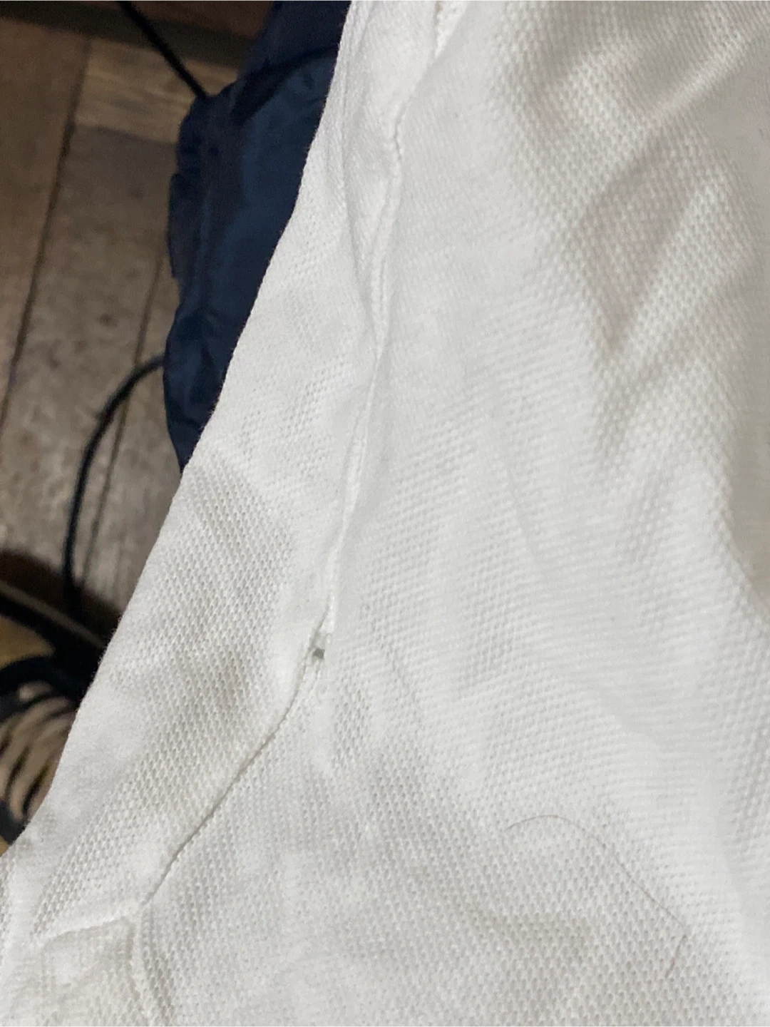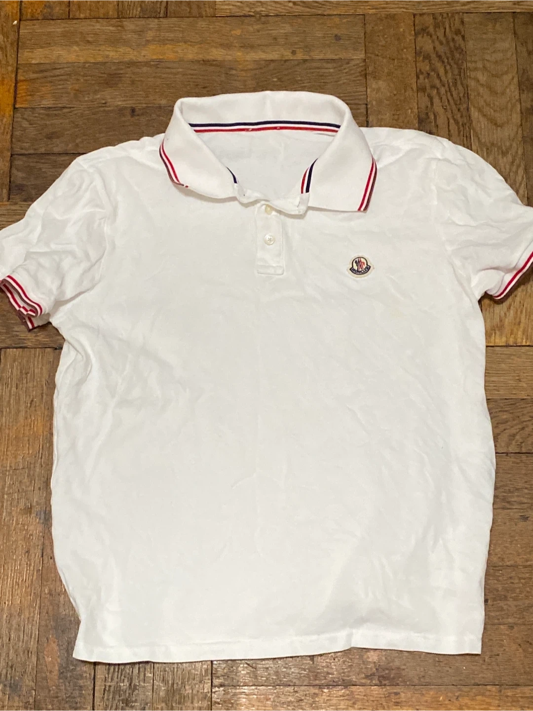 Classic white Moncler polo shirt with iconic logo detailing. Features striped collar and cuffs. Some minor yellow staining is present on the front, and a small pull near the hem. Ready for a new home!