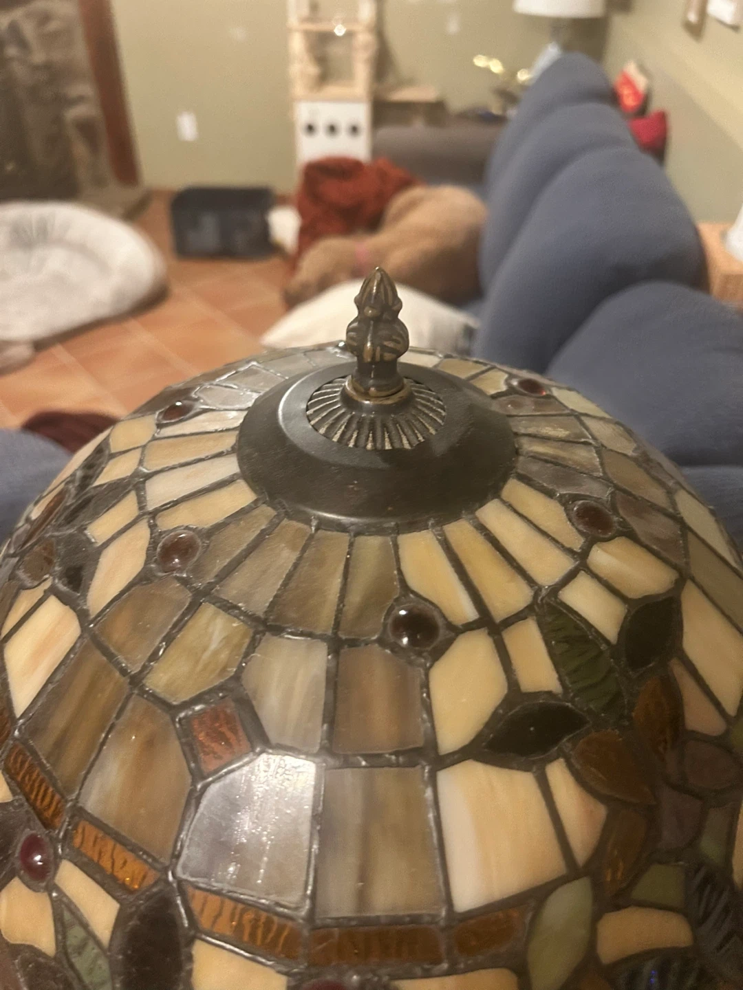 **missing the cap that secures the shade to the base. Despite this, it has been used daily. The shade rests easily and safely atop the base. Price reflects this missing piece.