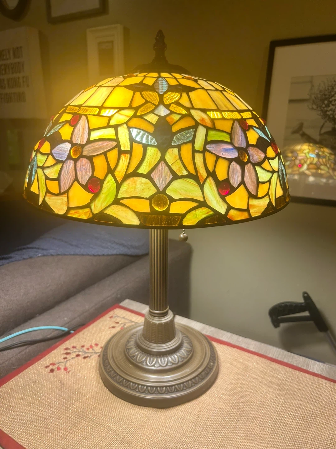 Beautiful stained glass table lamp with a warm, inviting glow. The shade features a lovely floral pattern in various earth tones and pops of colour. Base is a bronze-toned metal. Perfect for adding ambiance to any room!