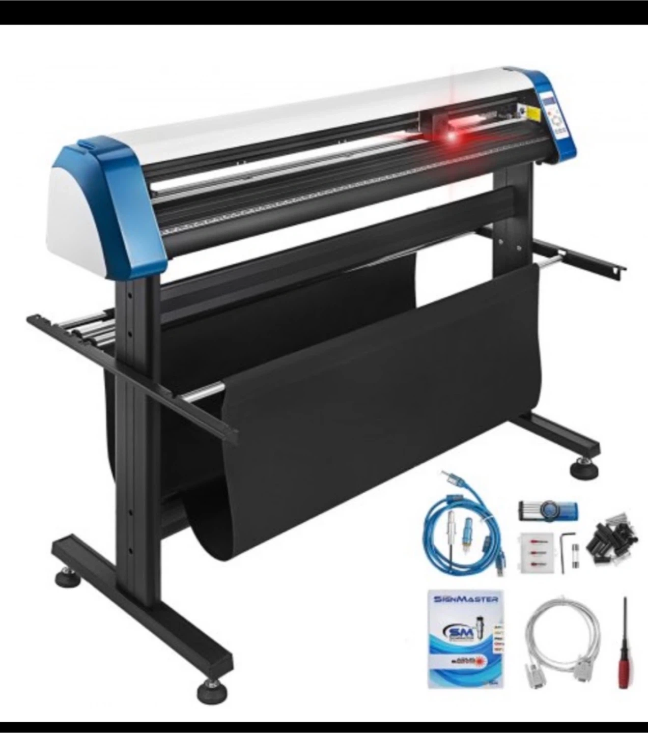 This SignMaster vinyl cutter plotter comes with a stand and all the necessary accessories for immediate use. It features a red laser guide for precise cutting. Includes cables, software disc, and tools. Bought in 1000$. + tax selling in 750$