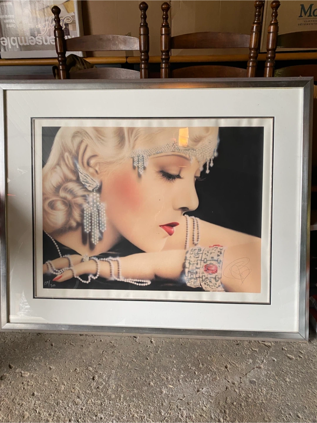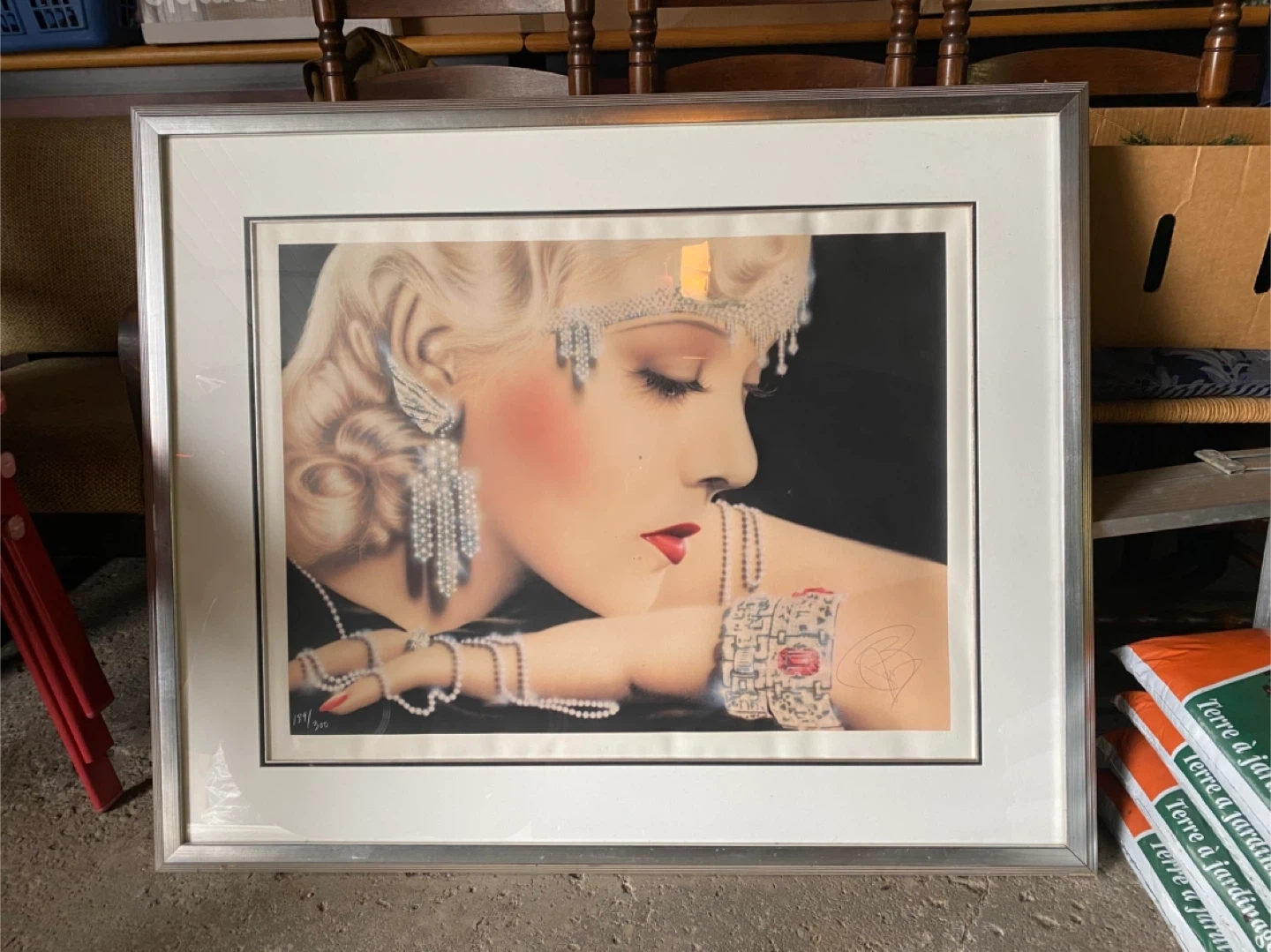 Beautiful framed art print featuring a stylized flapper-era woman. Includes a signature and edition number (199/500) visible in the lower corner. The matte silver frame complements the artwork nicely.