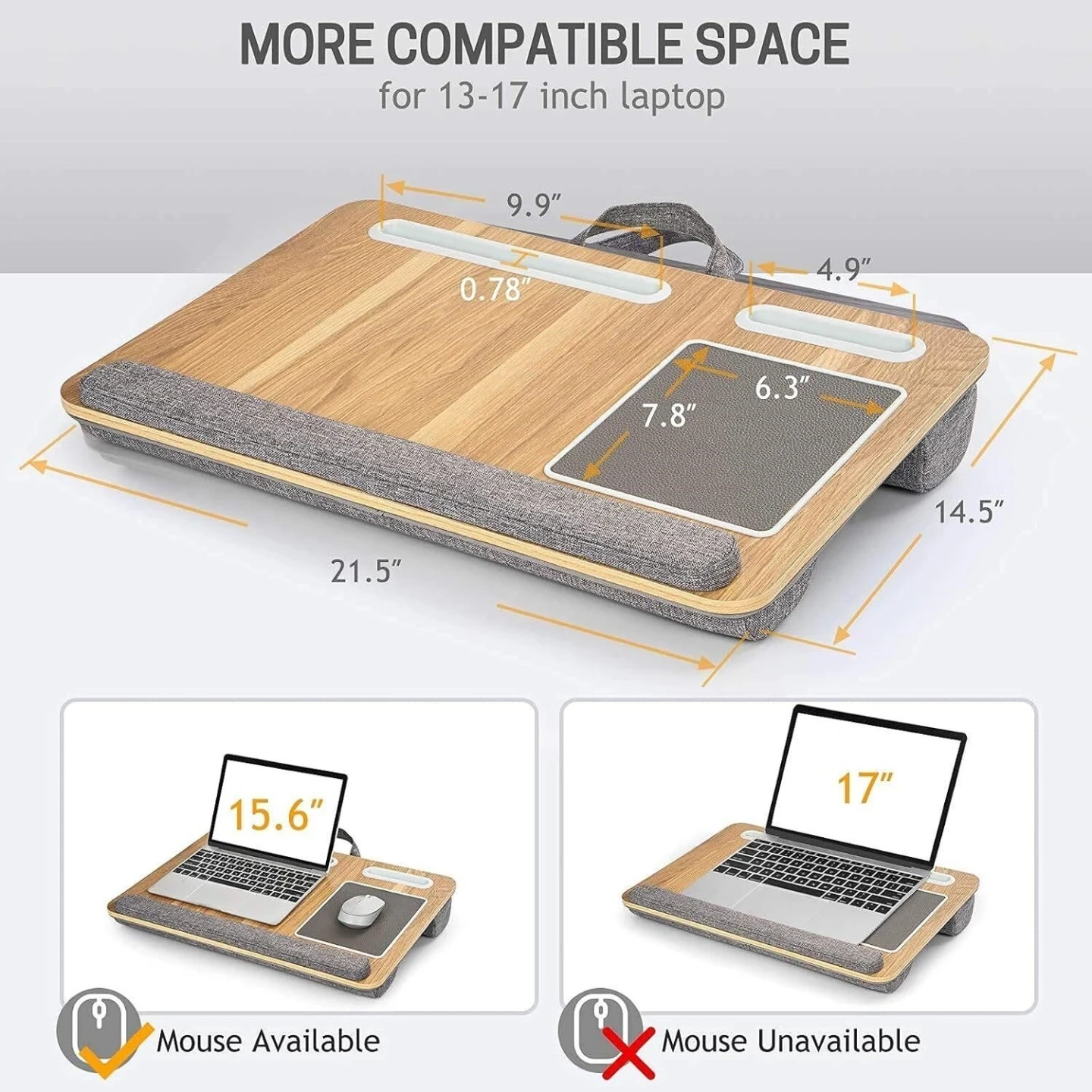 This lap desk is designed for 13-17 inch laptops, offering a comfortable workspace anywhere. It features a built-in wrist rest for added comfort and a convenient holder for your phone. The smooth wooden surface and cushioned base make it ideal for use on the couch or at a table. Works great for productivity on the go!