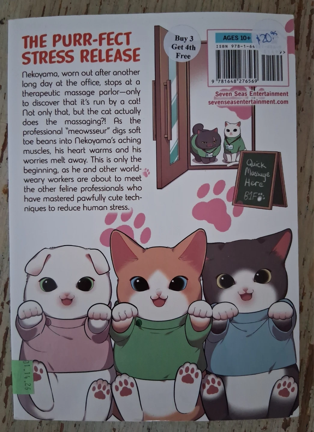 This is volume 1 of the Cat Massage Therapy manga, written and illustrated by Haru Hisakawa. It features a story about Nekoyama discovering the stress-relieving benefits of a massage therapy run by cats. Ages 10+.