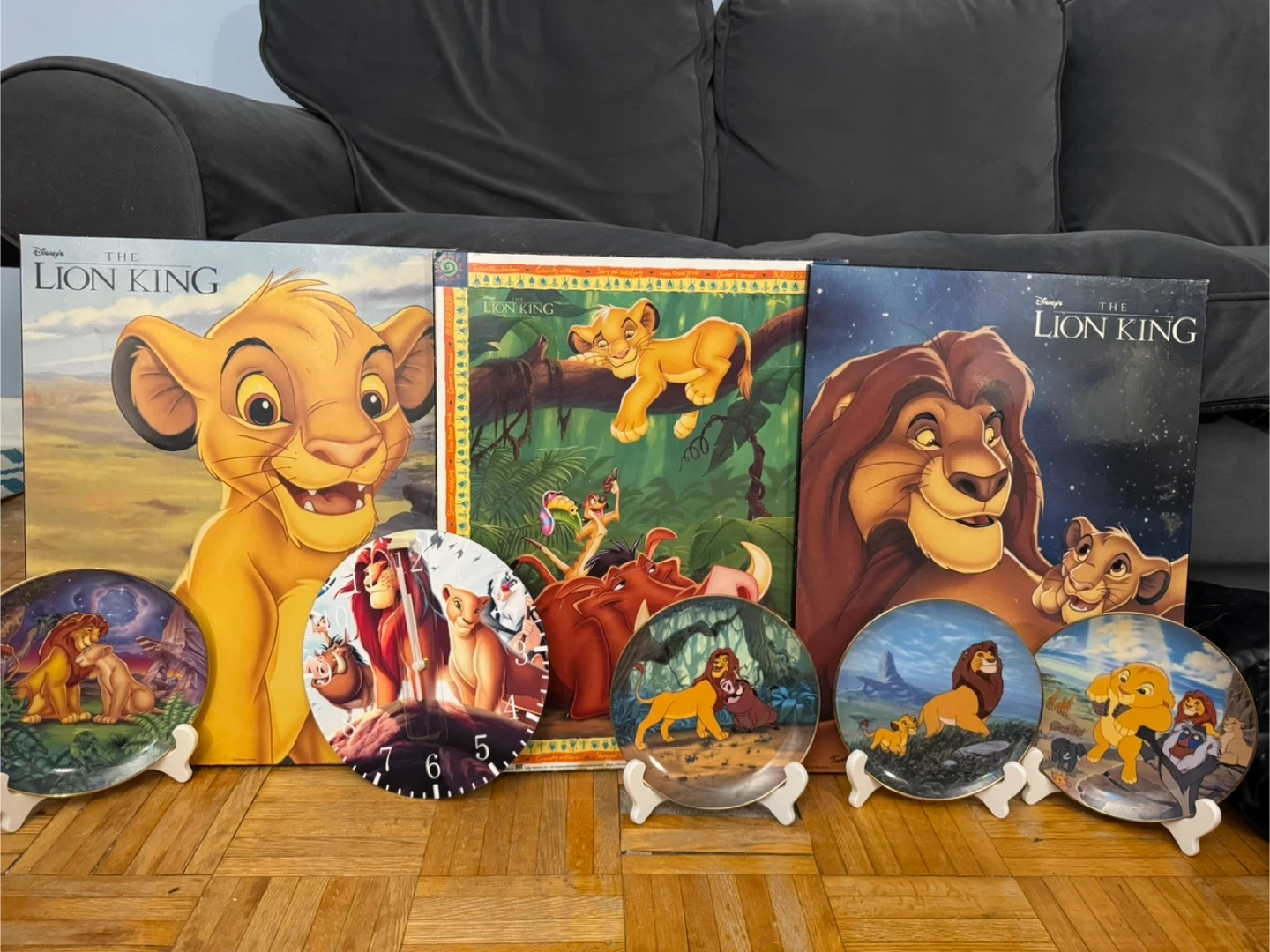 This set includes decorative plates and artwork featuring characters from Disney's The Lion King. The plates showcase iconic scenes and characters. The artwork pieces also display beloved characters.