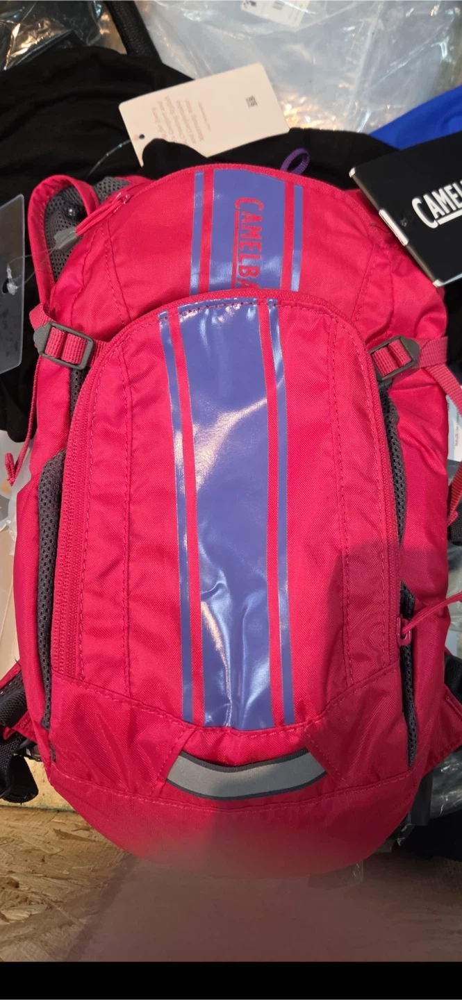 This is a pink CamelBak hydration backpack. It's made of durable material with mesh accents for breathability. The backpack features reflective details for visibility. It's great for outdoor activities and cycling!