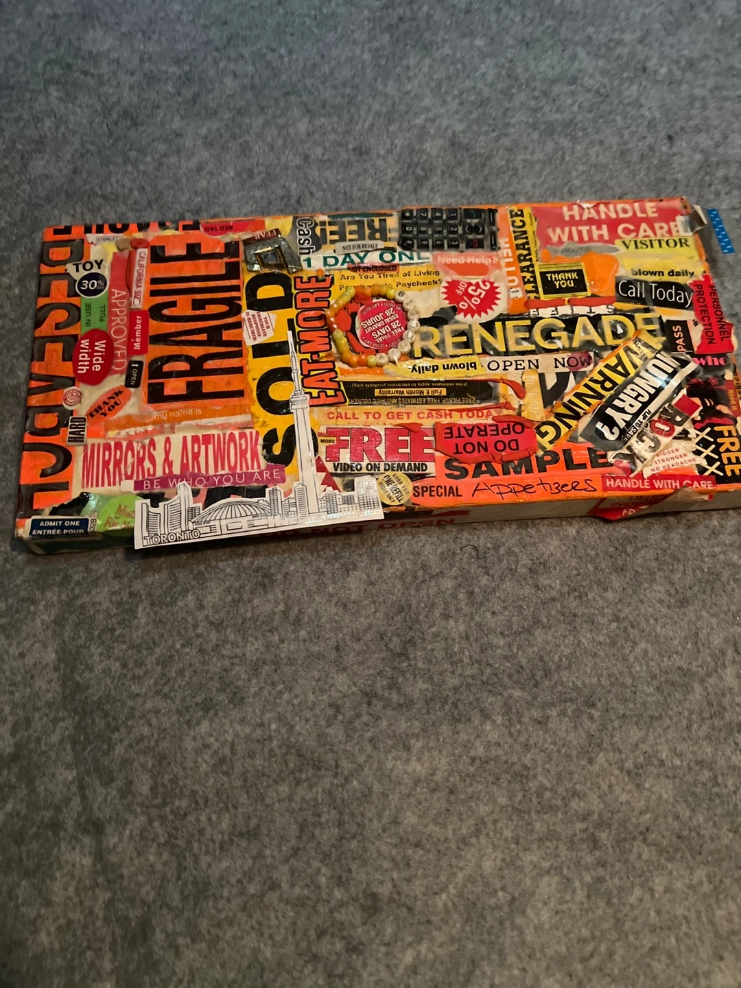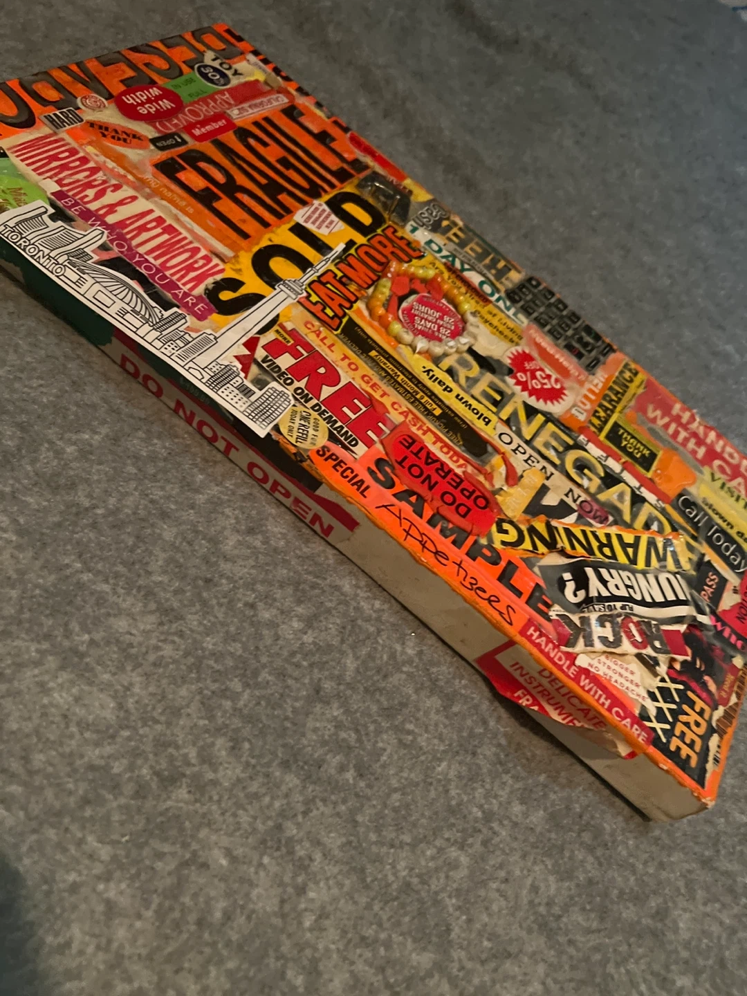 This is a unique art piece featuring a collage of various stickers and labels. It has a 'Fragile' warning and 'Handle with Care' instructions. The artwork is designed to catch the eye with its busy, layered aesthetic. It's ready to be displayed!