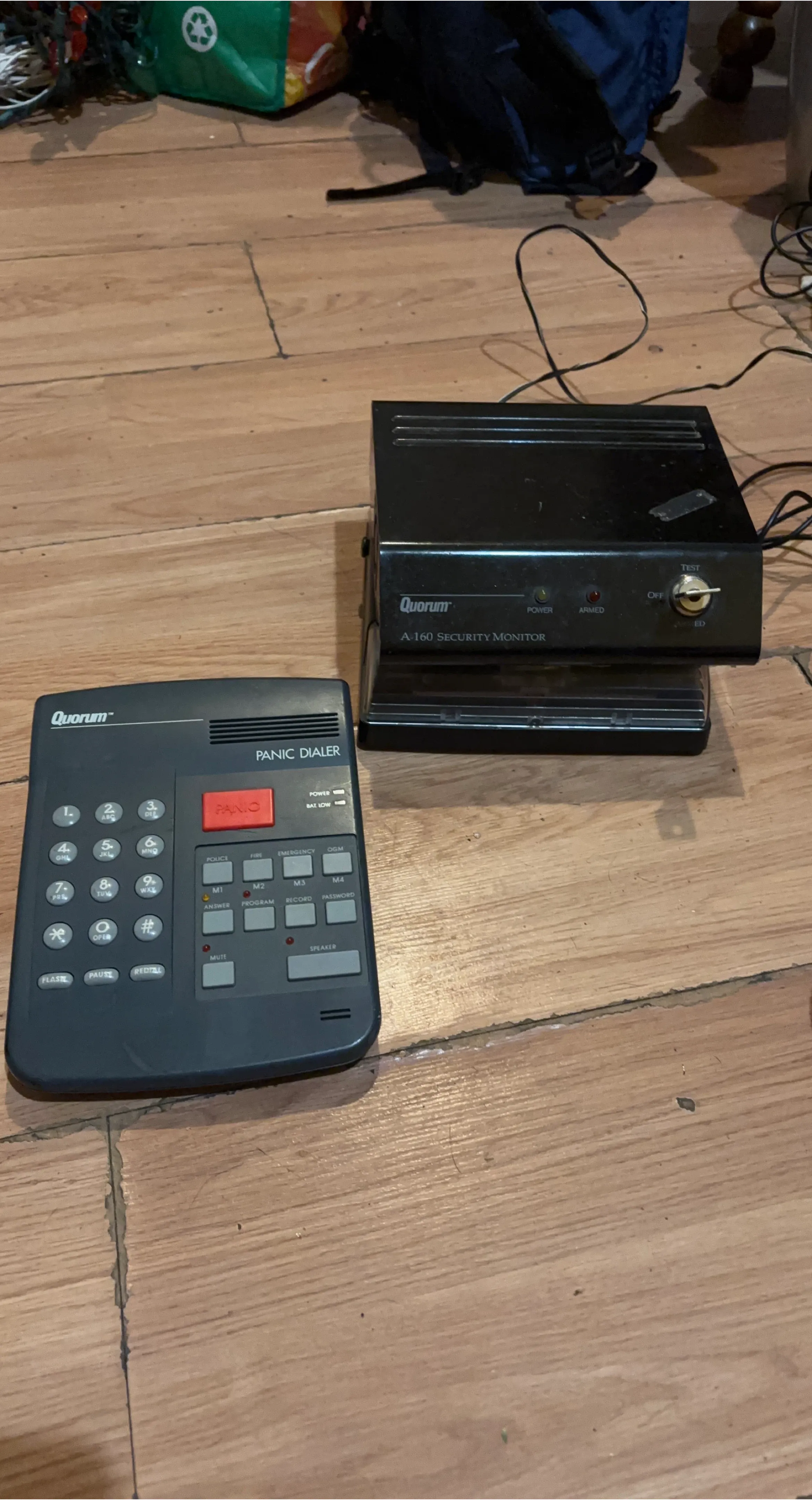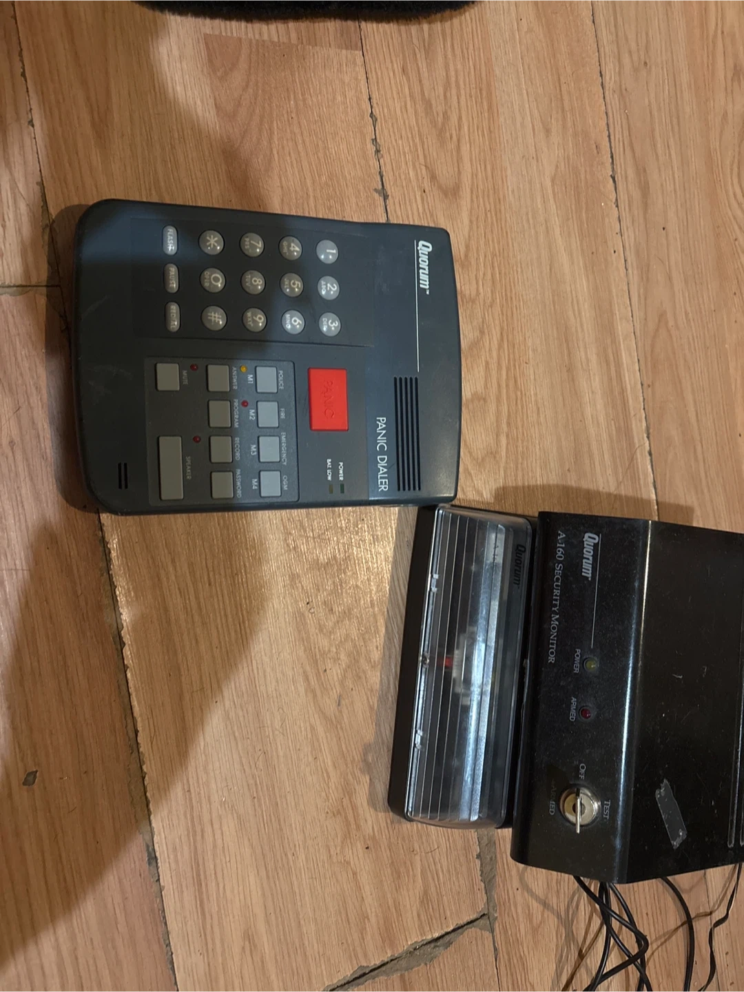 This is a Quorum Panic Dialer and A-160 Security Monitor system. It includes the keypad dialer unit and the main security monitor box. The security monitor has indicator lights for power, armed, and alarm status.
