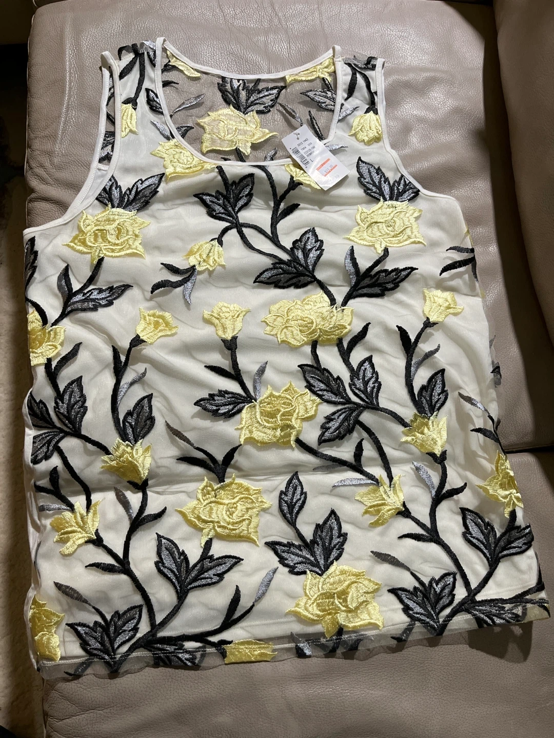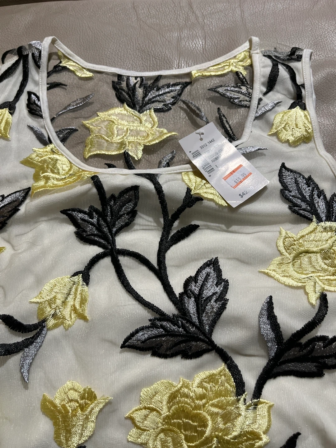 This sleeveless white top features a delicate sheer overlay with vibrant yellow floral embroidery and black leaf accents. It has a round neckline and a comfortable, lightweight feel. Perfect for adding a touch of style to your casual outfits!
