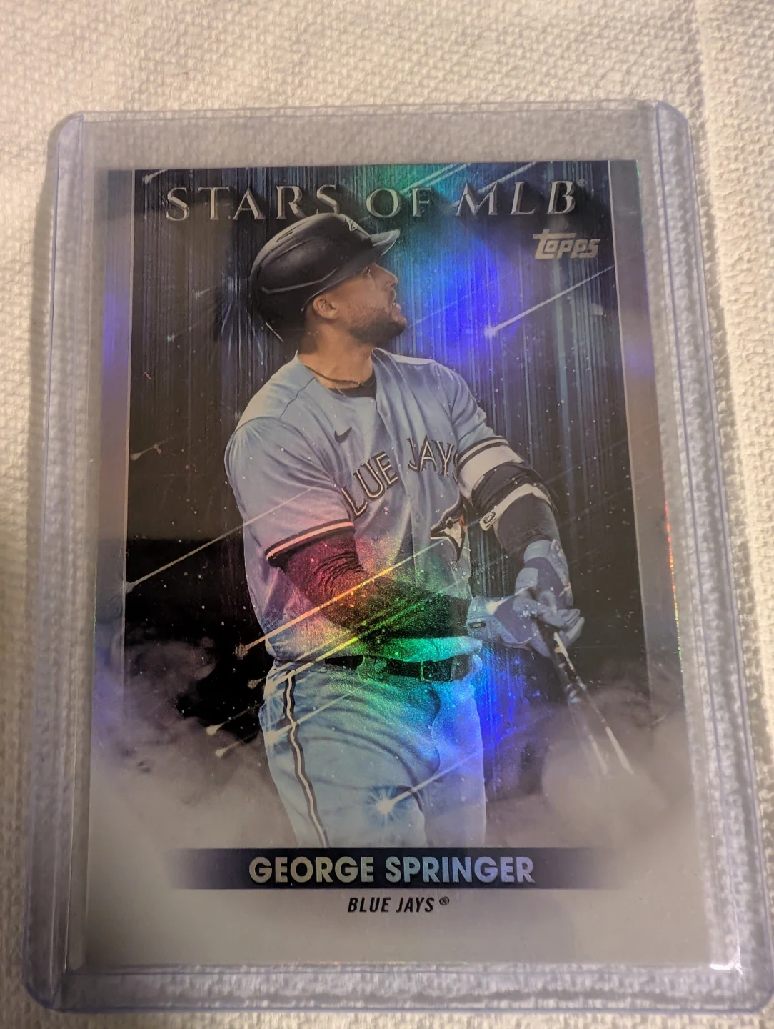 This is a 2022 Topps Stars of MLB trading card featuring George Springer of the Toronto Blue Jays. The card celebrates his home run production and accolades. It's in a protective sleeve.